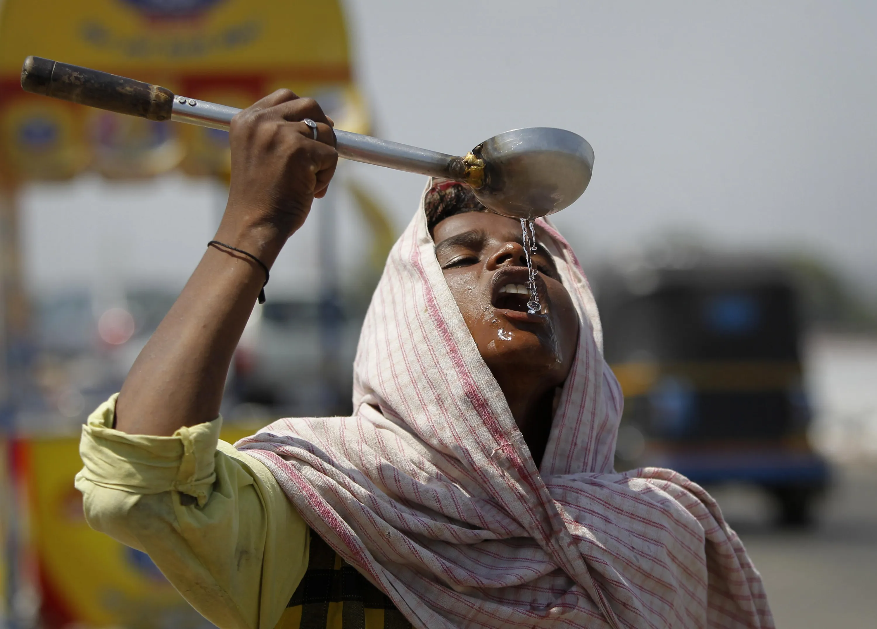 A street vendor drinks water on a hot afternoon on the outskirts of Jammu, India, Friday, May 27, 2016. Temperatures across much of northern and western India have hovered around 40 degrees Celsius (104 degrees Fahrenheit) for weeks causing much distress, specially amongst the farming communities. (Photo by Channi Anand/AP Photo)