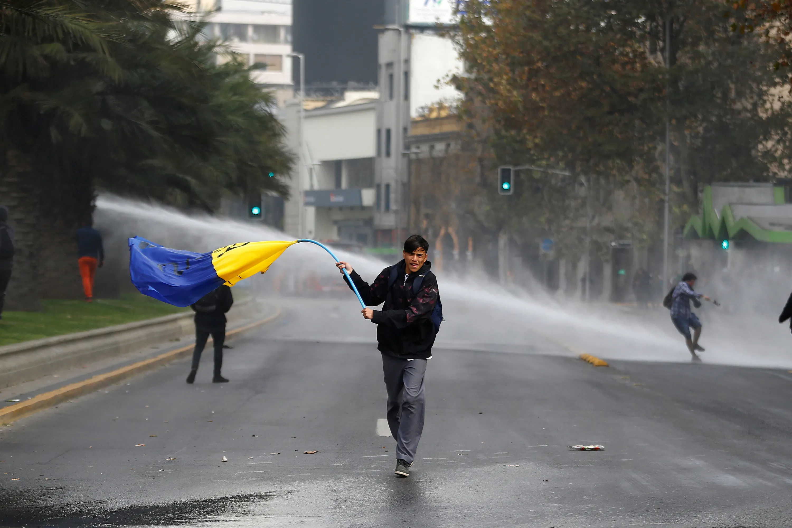 A demonstrator waves a flag as they clash with riot police during an unauthorized march called by secondary students to protest against government education reforms in Santiago, Chile, May 26, 2016. (Photo by Ivan Alvarado/Reuters)