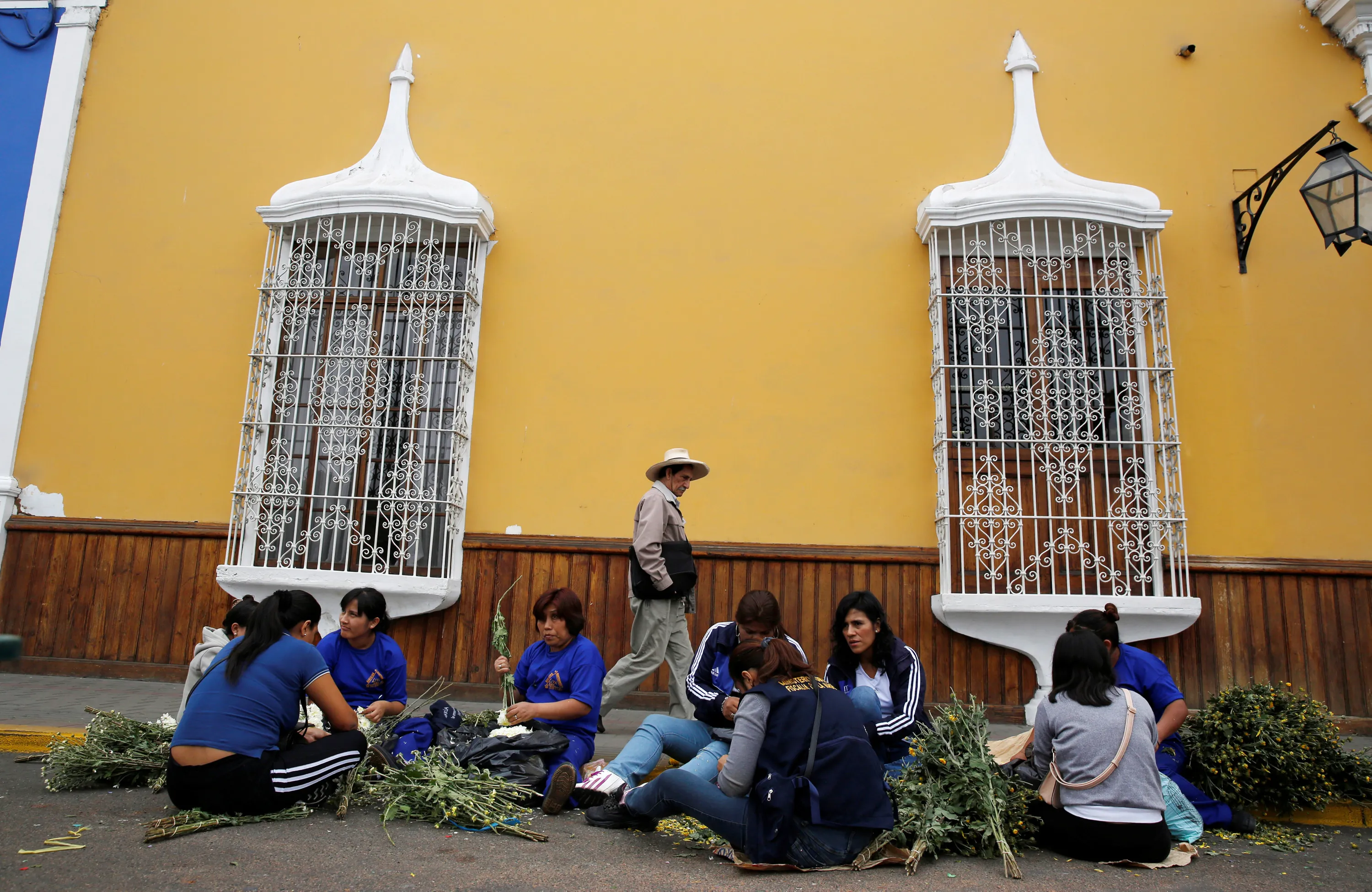 People arrange flowers for a sawdust and flower carpet during the feast of Corpus Christi in downtown Trujillo, Peru, May 26, 2016. (Photo by Mariana Bazo/Reuters)