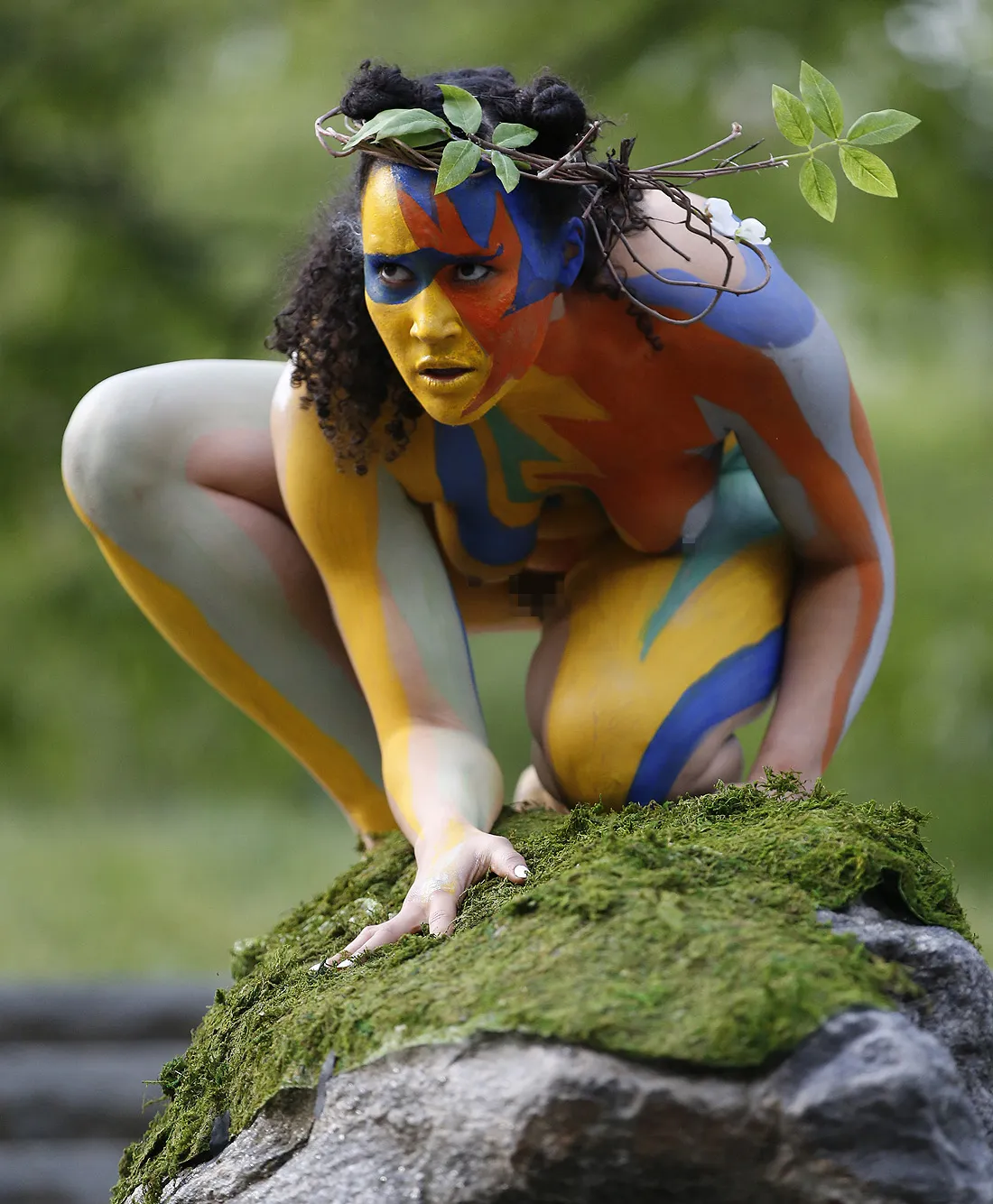 Reanna Roane, as “Ariel”, perches on a rock in Central Park during the Outdoor Co-Ed Topless Pulp Fiction Appreciation Society theater company's performance of Shakespeare's “The Tempest”, Thursday, May 19, 2016, in New York. (Photo by Kathy Willens/AP Photo)