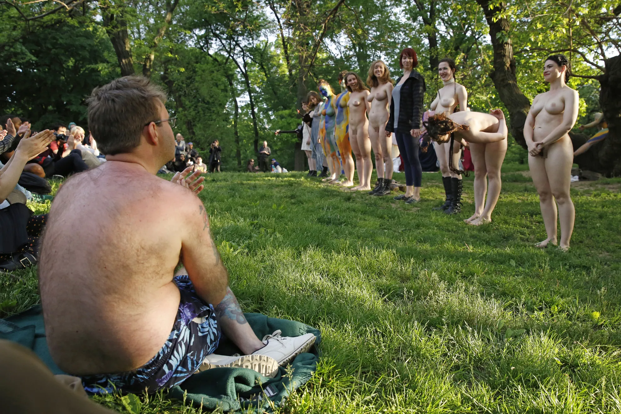 A spectator wearing a bathing suit, left, watches as members of the mostly nude, all-female cast of the Outdoor Co-Ed Topless Pulp-Fiction Appreciation Society theater company take their bows following the company's production of Shakespeare's “The Tempest”, in Central Park, Thursday, May 19, 2016, in New York. (Photo by Kathy Willens/AP Photo)