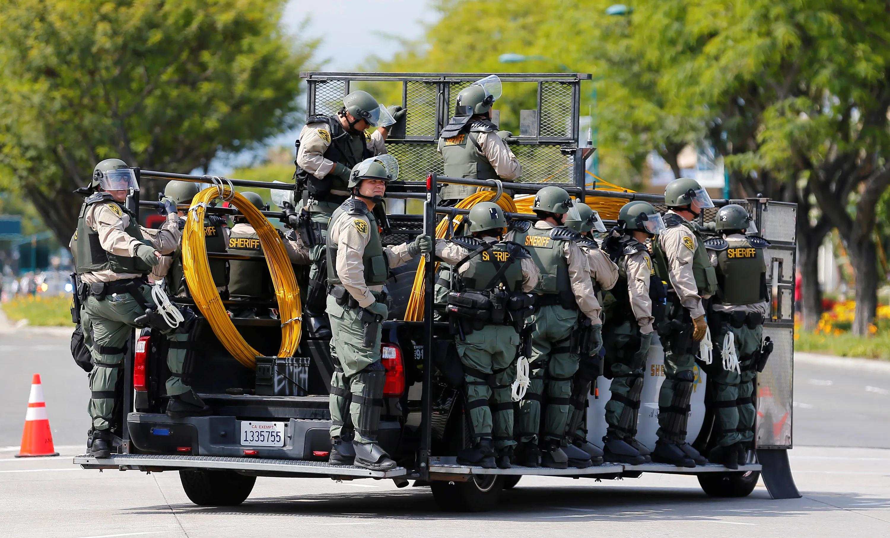 Los Angeles Sheriff Department deputies ride a vehicle during demonstrations against Republican U.S. Presidential candidate Donald Trump, who spoke at a campaign event in Anaheim, California, U.S., May 25, 2016. (Photo by Mike Blake/Reuters)