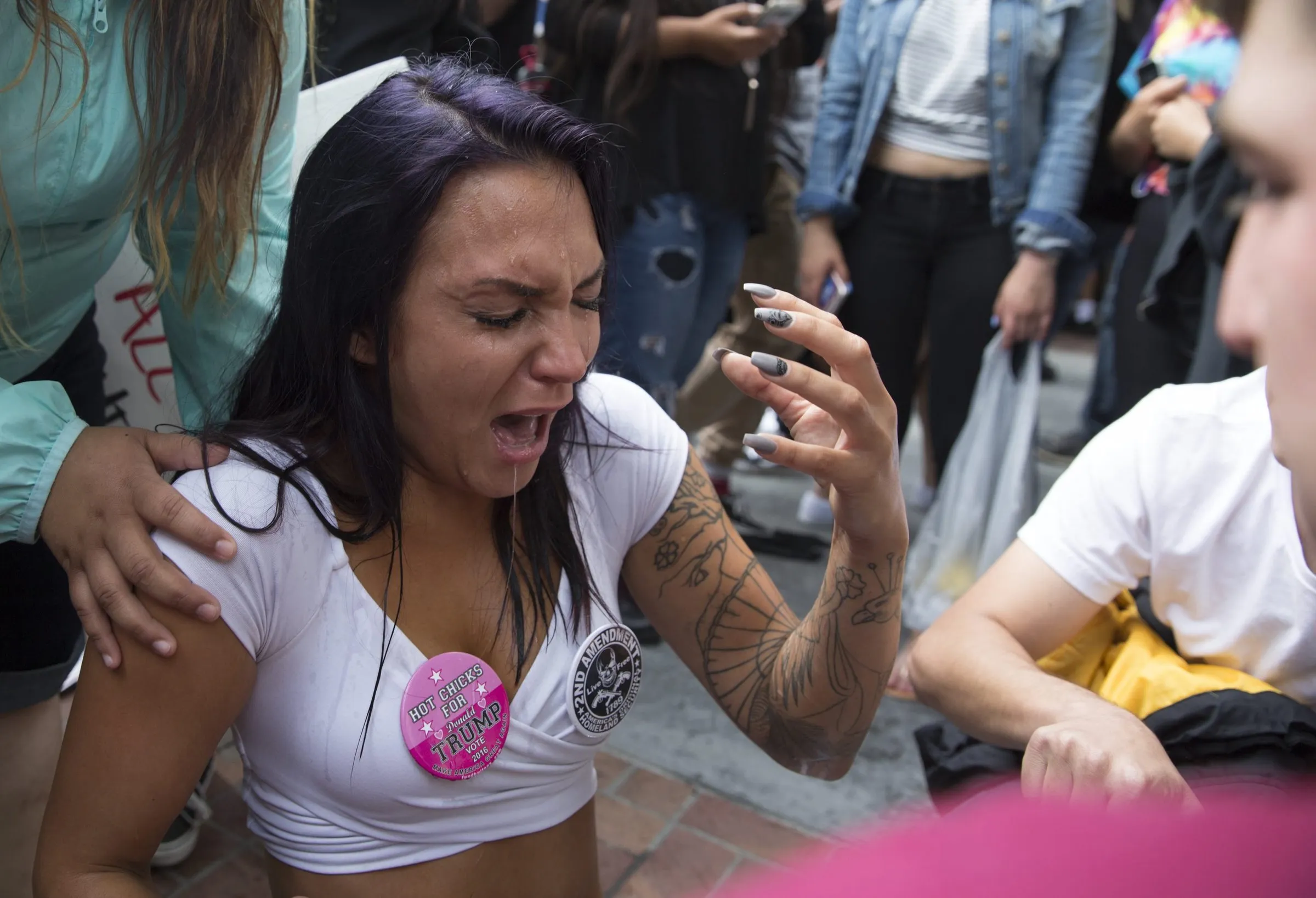 A supporter of US Republican Party presidential candidate Donald Trump screams after coming in contact with pepper spray during a scuffle with protesters after Trump's campaign rally at the Convention Center in San Diego, California, 27 May 2016. Trump is campaigning in California before the state holds its presidential primary on 07 June. (Photo by Eugene Garcia/EPA)