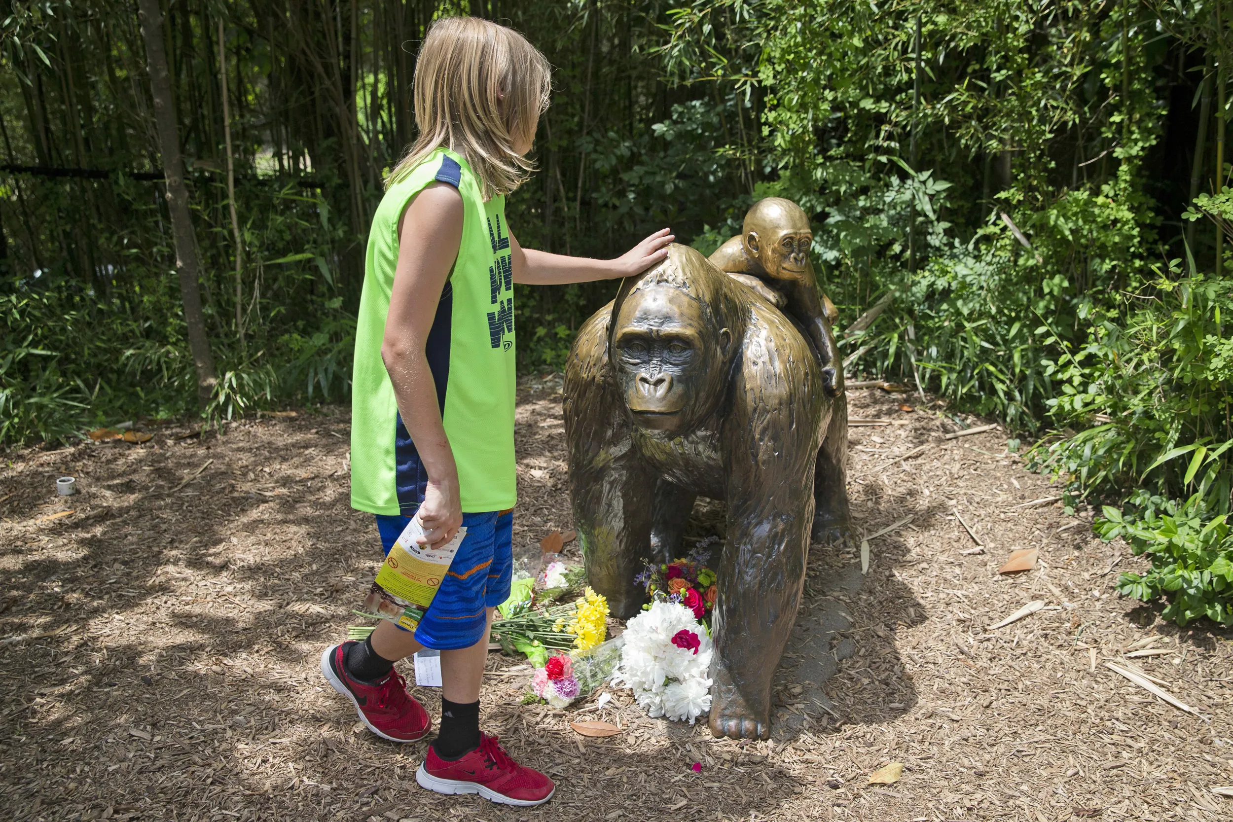 A child touches the head of a gorilla statue where flowers have been placed outside the Gorilla World exhibit at the Cincinnati Zoo & Botanical Garden, Sunday, May 29, 2016, in Cincinnati. On Saturday, a special zoo response team shot and killed Harambe, a 17-year-old gorilla, that grabbed and dragged a 4-year-old boy who fell into the gorilla exhibit moat. Authorities said the boy is expected to recover. He was taken to Cincinnati Children's Hospital Medical Center. (Photo by John Minchillo/AP Photo)