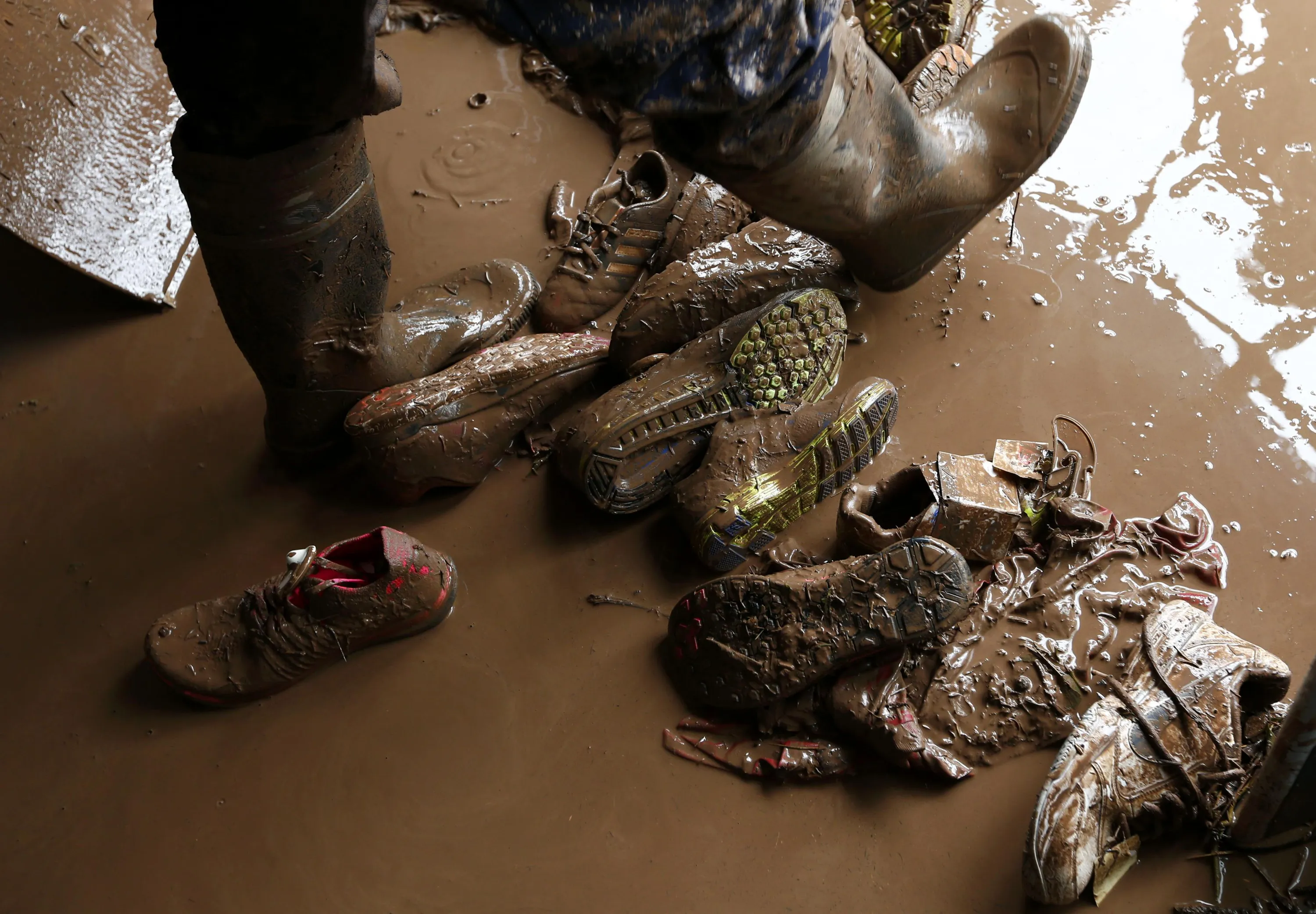 An employee clears flood damage at Intersport Schoell sporting goods store in the town of Schwaebisch Gmuend near Stuttgart, Germany, May 30, 2016. (Photo by Michaela Rehle/Reuters)