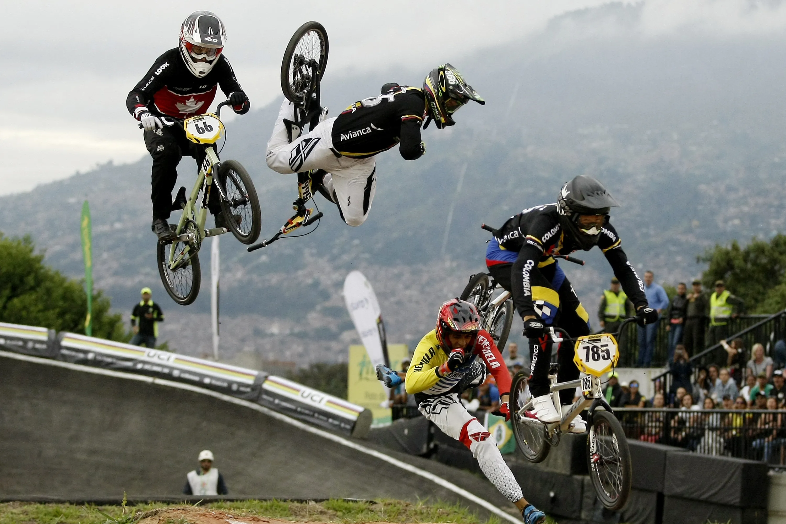 Carlos Mario Oquendo of Colombia (2-L, up) falls along Jefferson Milano of Venezuela (2-R, bottom), during the finals of the elite men's World UCI BMX Championship in Medellin, Colombia, 29 May 2016. (Photo by Luis Eduardo Noriega/EPA)