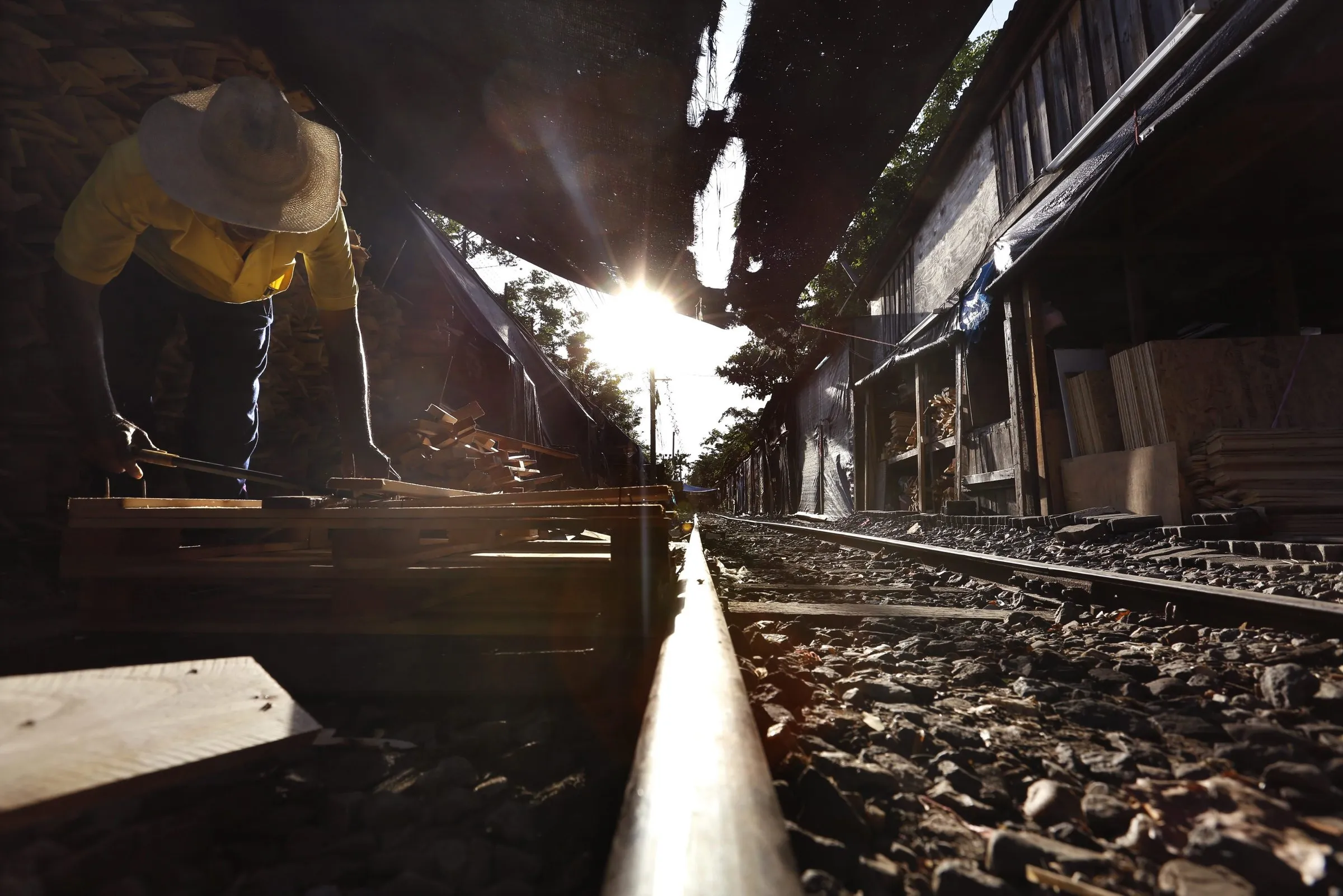 A picture made available on 30 May 2016 shows a Thai carpenter working as the sun sets preparing recycled wood from shipping pallets and crates, on the railway line home and workplace, near Bangkok's Klong Toey port, in Bangkok, Thailand, 23 May 2016. A group of wood workers and artisan furniture makers have created a carpentry community within the city's oldest and largest slum, recycling white pine wood shipping pallets into re-saleable wood, and creating sought after wood furniture products. But change is coming. Nailed onto wooden shacks along the line the furniture workers call home, tattered court ordered eviction notices are blowing in the wind. The community here is trespassing, according to the Bangkok Port Authority, who want the land back for road expansion as it leads to the major port Klong Toey port facility and entry gates. (Photo by Barbara Walton/EPA)