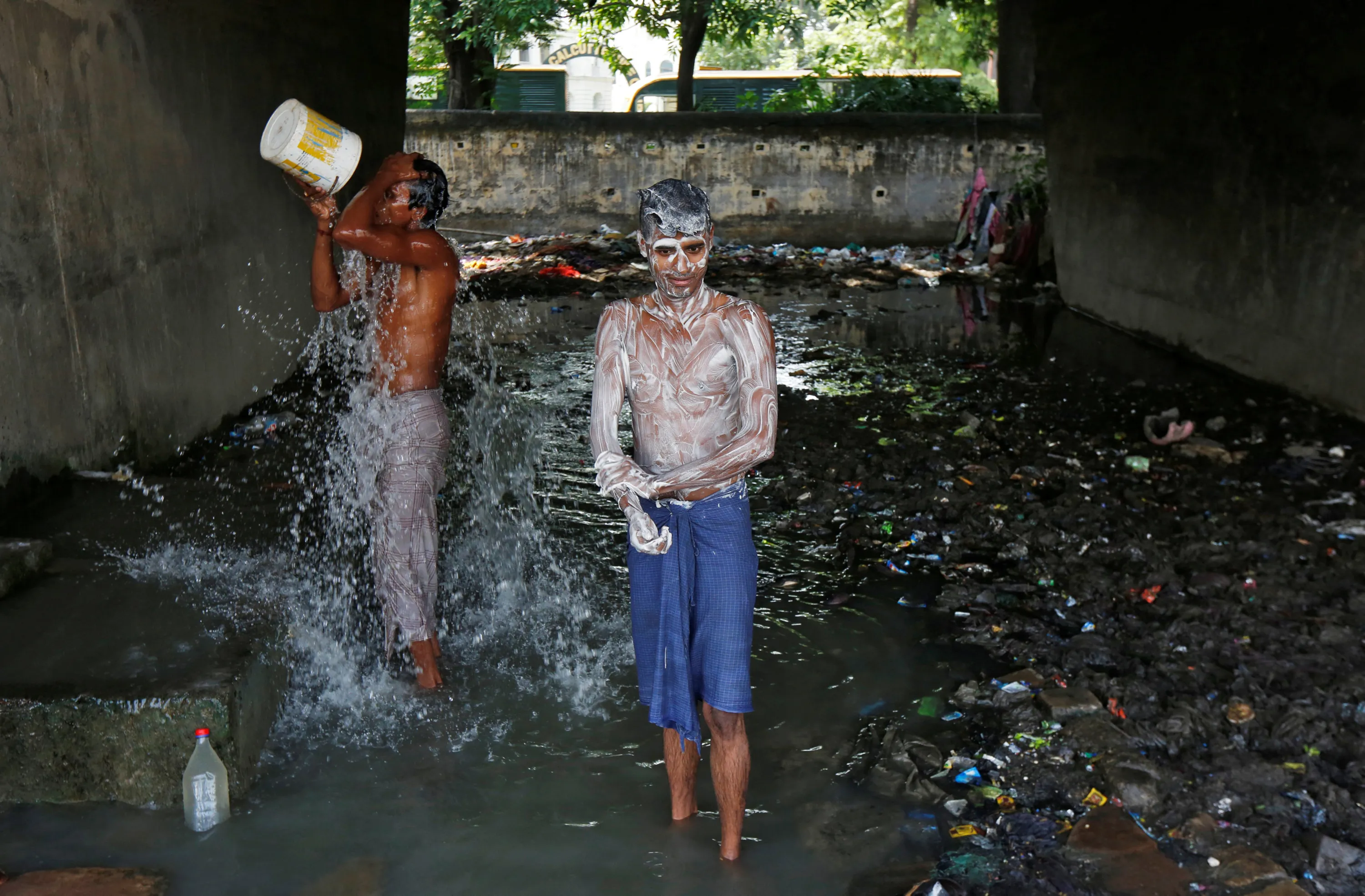 Men bathe at a concrete water pen under a flyover at a slum area in Kolkata, India May 26, 2016. (Photo by Rupak De Chowdhuri/Reuters)