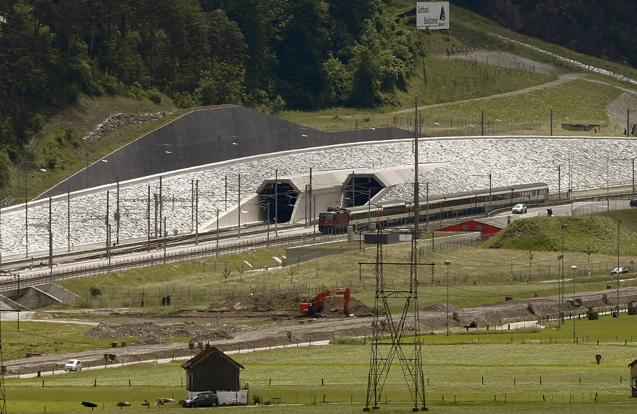 A train drives past the northern gates of the NEAT Gotthard Base Tunnel near the town of Erstfeld, Switzerland March 31, 2016. The 57.1-km (35.5 mile)-long Gotthard Base Tunnel, 17 years under construction and designed to last a century, is part of a 23 billion Swiss franc infrastructure project to speed passengers and cargo by rail under the mountain chain that divides Europe's north and south. Around 260 freight trains and 65 passenger trains will traverse the two-tube tunnel daily once final testing ends later this year. Engineers had to dig and blast through 73 kinds of rock as hard as granite and as soft as sugar. Nine workers died. (Photo by Arnd Wiegmann/Reuters)
