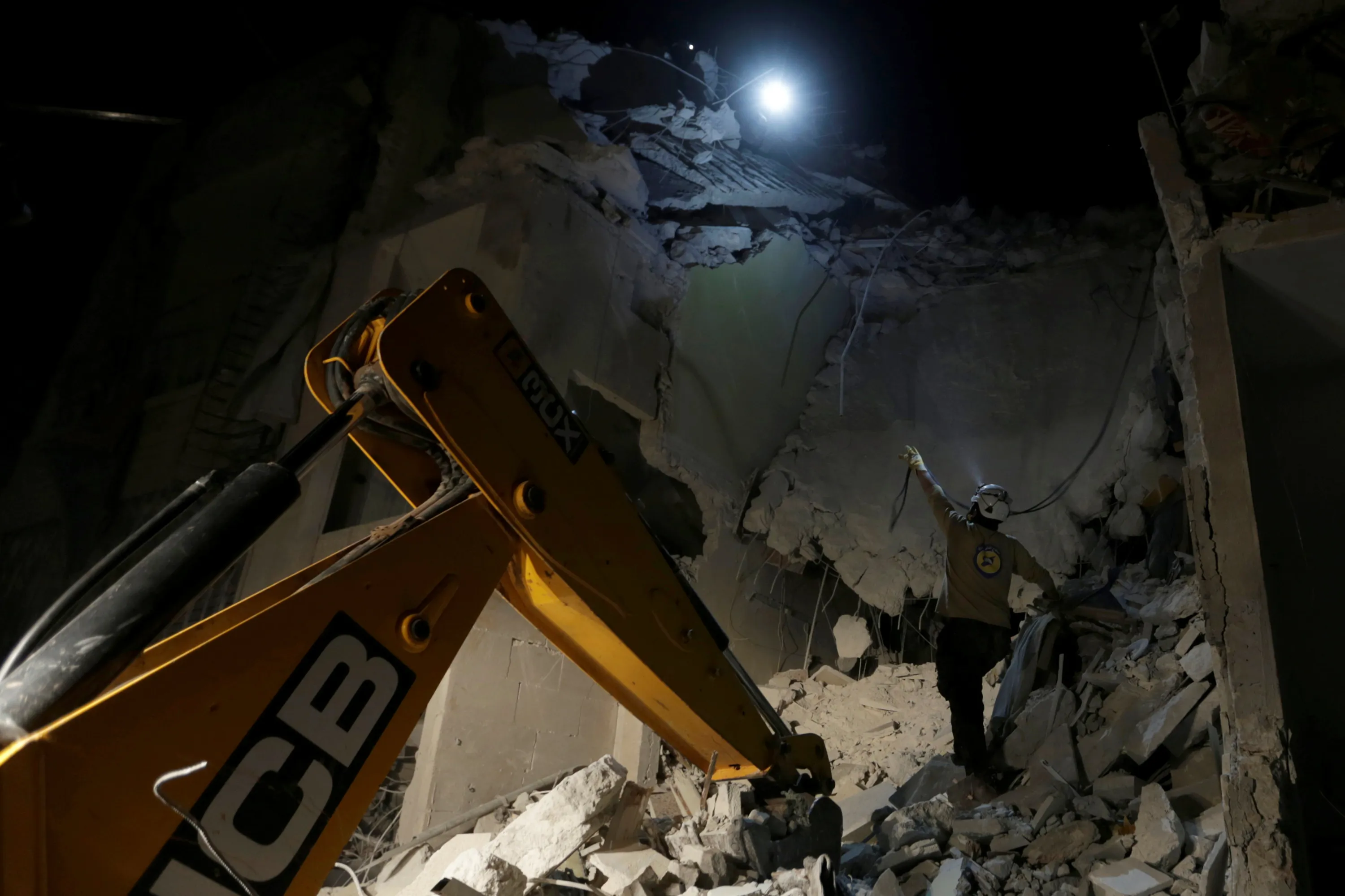 A civil defence member gestures to a fellow member near an excavator as they look for survivors at a site damaged after Russian air strikes on the Syrian rebel-held city of Idlib, Syria, early May 31, 2016. (Photo by Khalil Ashawi/Reuters)