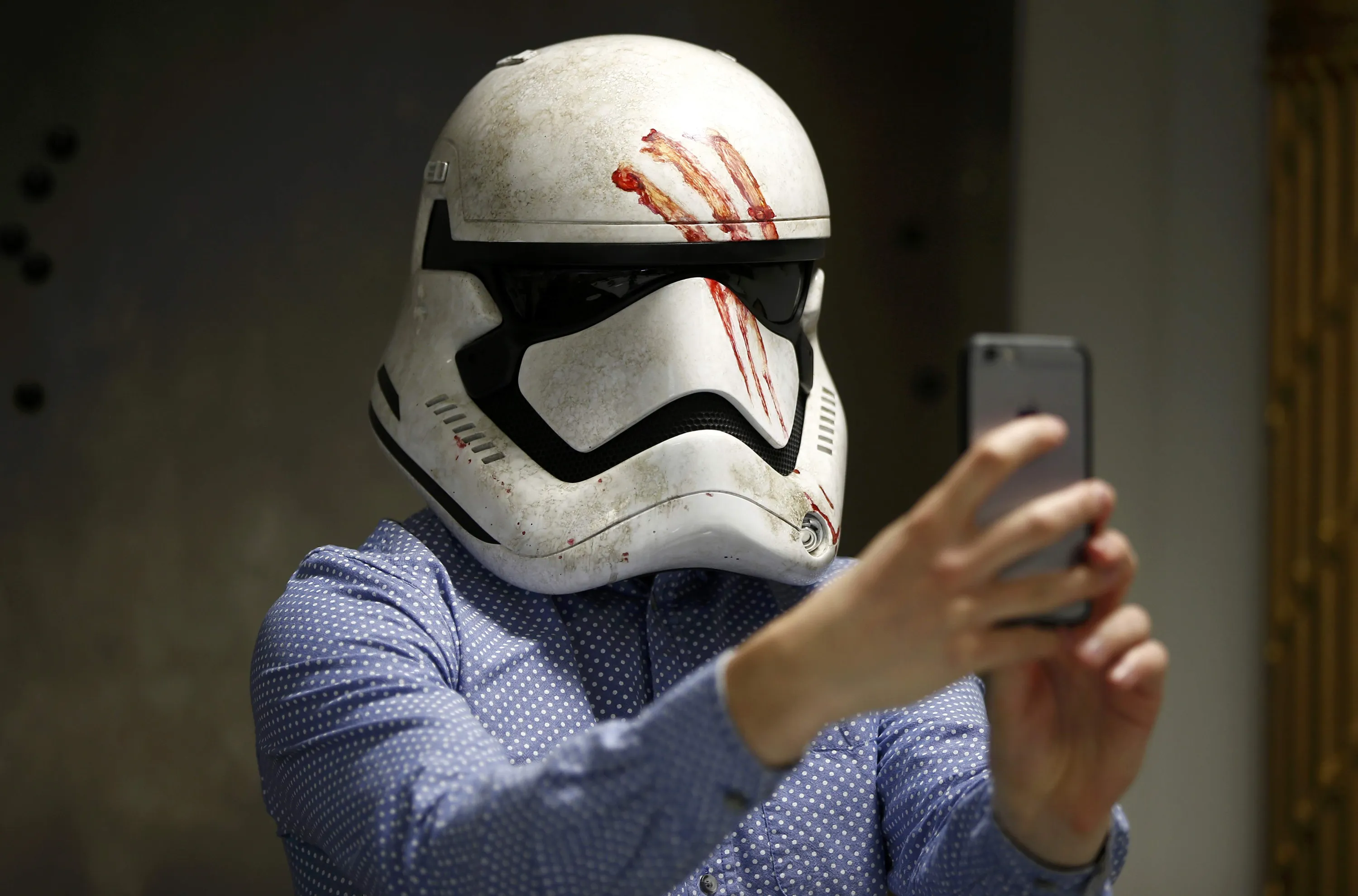A journalist takes a selfie whilst wearing a replica of Finn's Stormtrooper helmet from “Star Wars: The Force Awakens”, in the Propshop headquarters at Pinewood Studios near London, Britain May 25, 2016. (Photo by Peter Nicholls/Reuters)