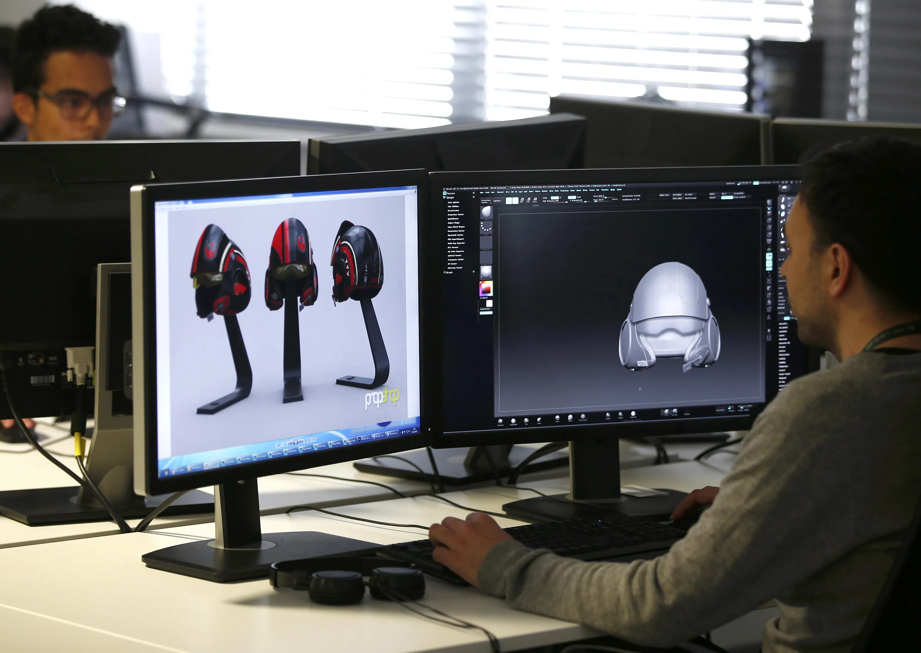 Images of Poe Dameron's helmet from “Star Wars: The Force Awakens”, are displayed on a computer screen in the Propshop headquarters at Pinewood Studios near London, Britain May 25, 2016. (Photo by Peter Nicholls/Reuters)