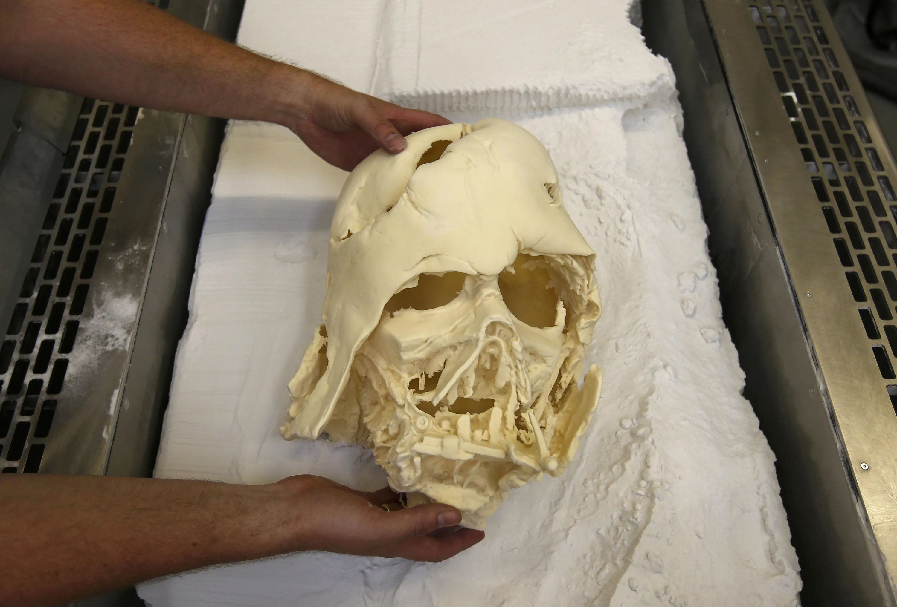 A technician demonstrats part of the production process of a 3D printed replica of Darth Vader's melted helmet from “Star Wars: The Force Awakens”, in the Propshop headquarters at Pinewood Studios near London, Britain May 25, 2016. (Photo by Peter Nicholls/Reuters)