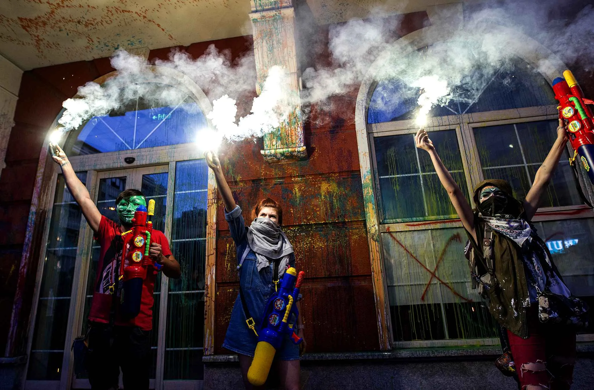Protesters light flares after they spray paint on the facade of the Ministry of Justice building, during an anti-government protest in Skopje on May 31, 2016, in a series of protests dubbed Colorful Revolution. Macedonia's president revoked on May 27 the pardons he had granted to 22 politicians implicated in a wiretapping scandal, after the move sparked outrage inside and outside the troubled Balkan country. (Photo by Robert Atanasovski/AFP Photo)