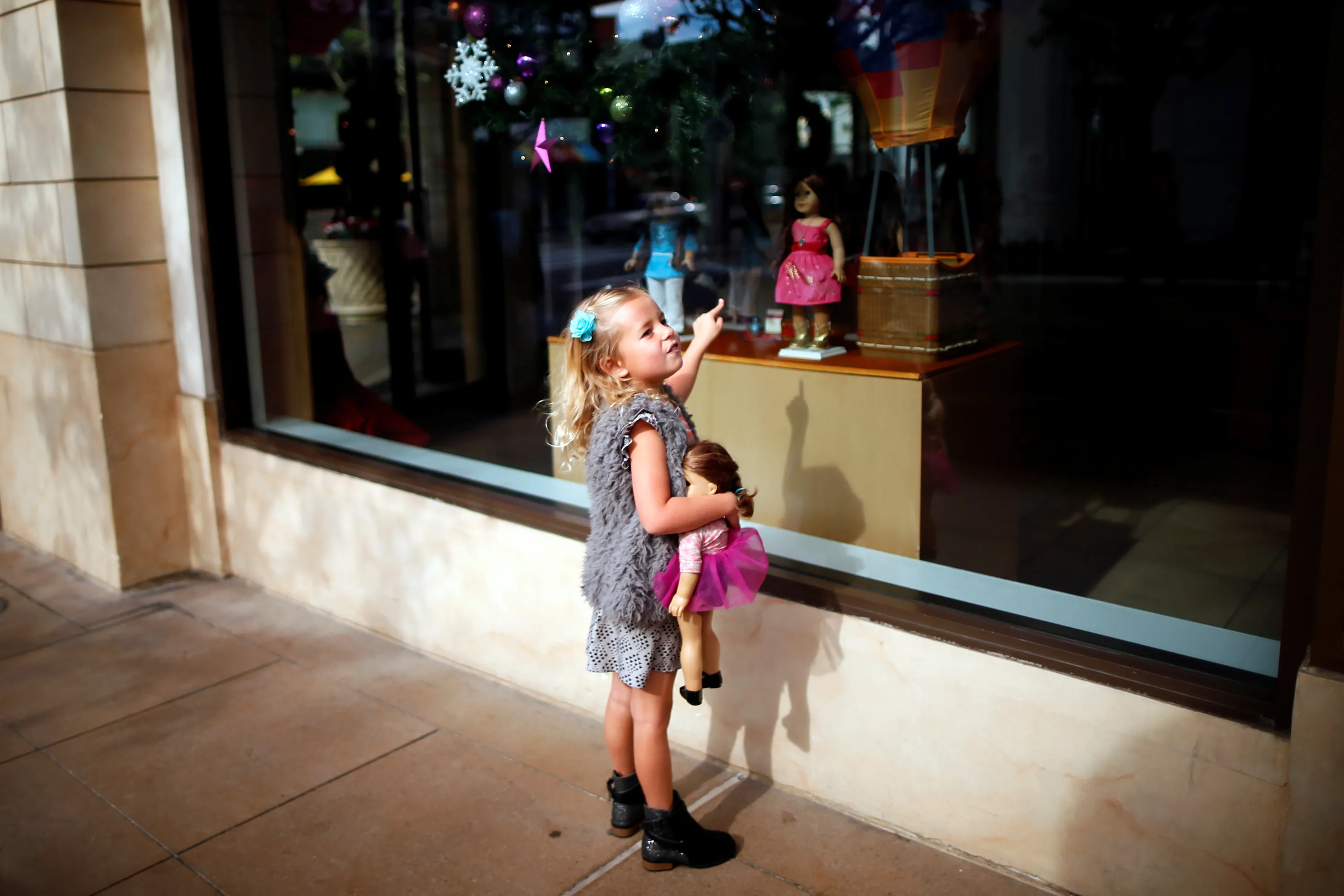Charli Crosby, 5, points to a doll in the window of an American Girl store at The Grove mall in Los Angeles November 26, 2013. (Photo by Lucy Nicholson/Reuters)