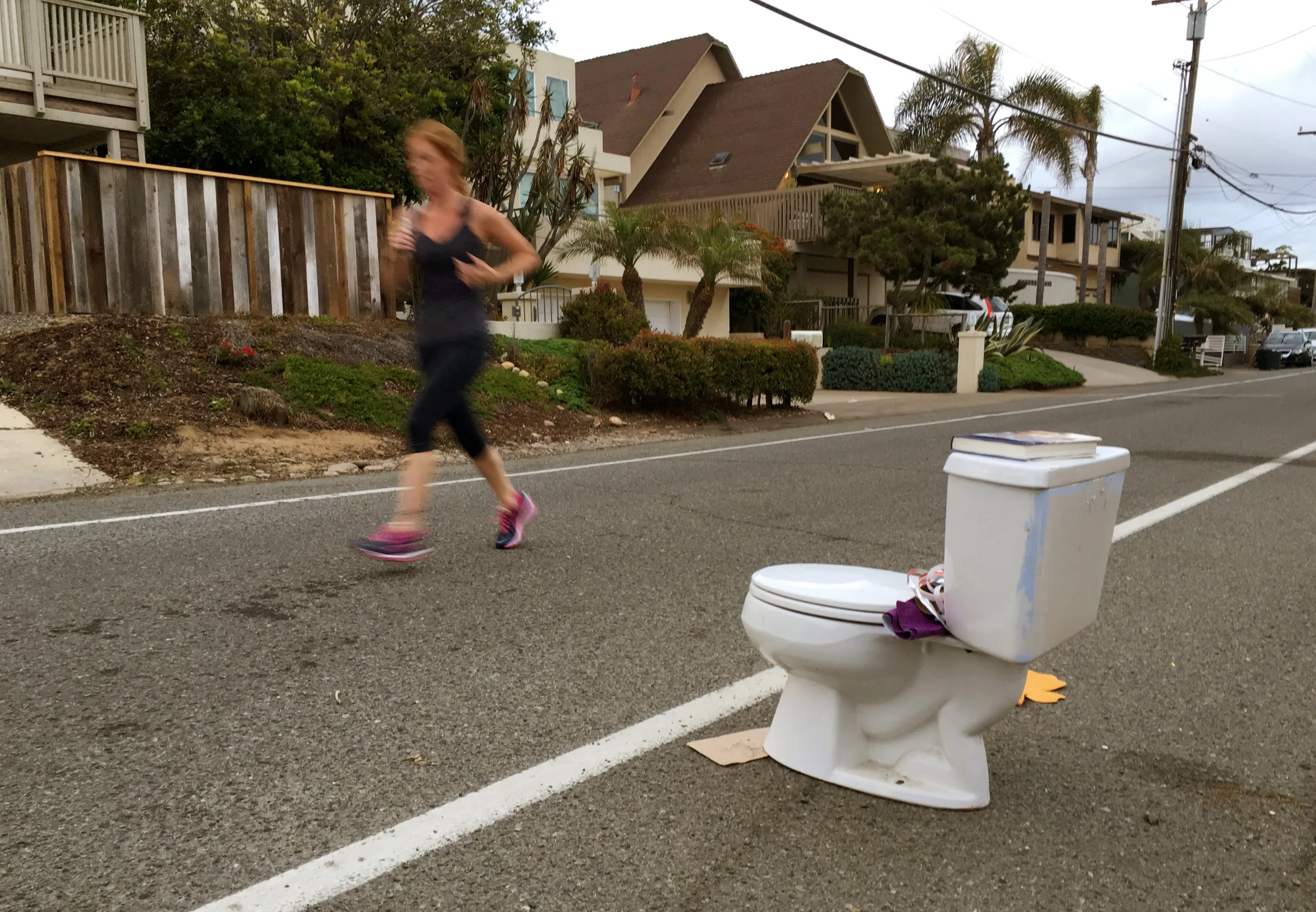 An early morning runner jogs past a toilet placed on the side of the road for free pick-up to any passerby in Leucadia, California, United States May 24, 2016. (Photo by Mike Blake/Reuters)