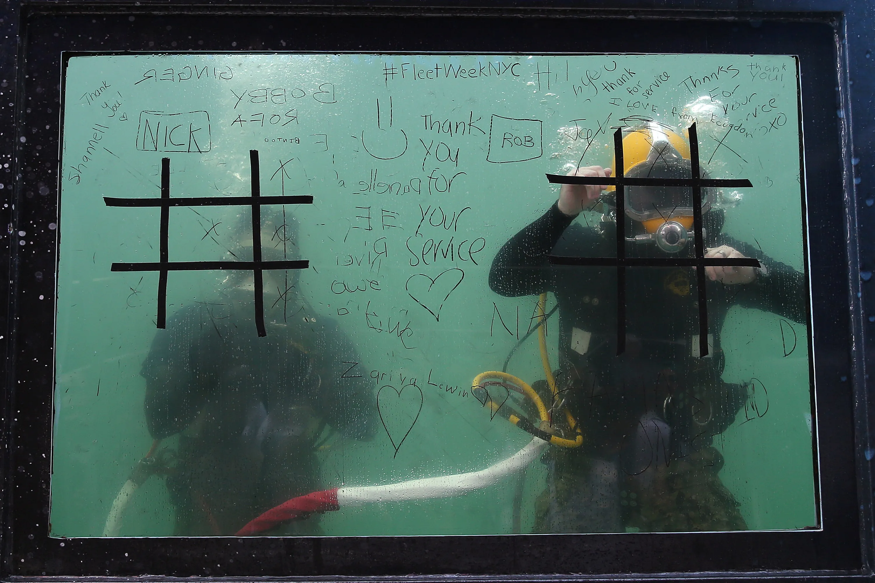 Divers are pictured waiting to play tic-tac-toe on the glass of a dive tank used by the U. S. Navy Mobile Diving and Salvage Unit for promotion during Fleet Week in Times Square in the Manhattan borough of New York, U.S., May 27, 2016. (Photo by Carlo Allegri/Reuters)