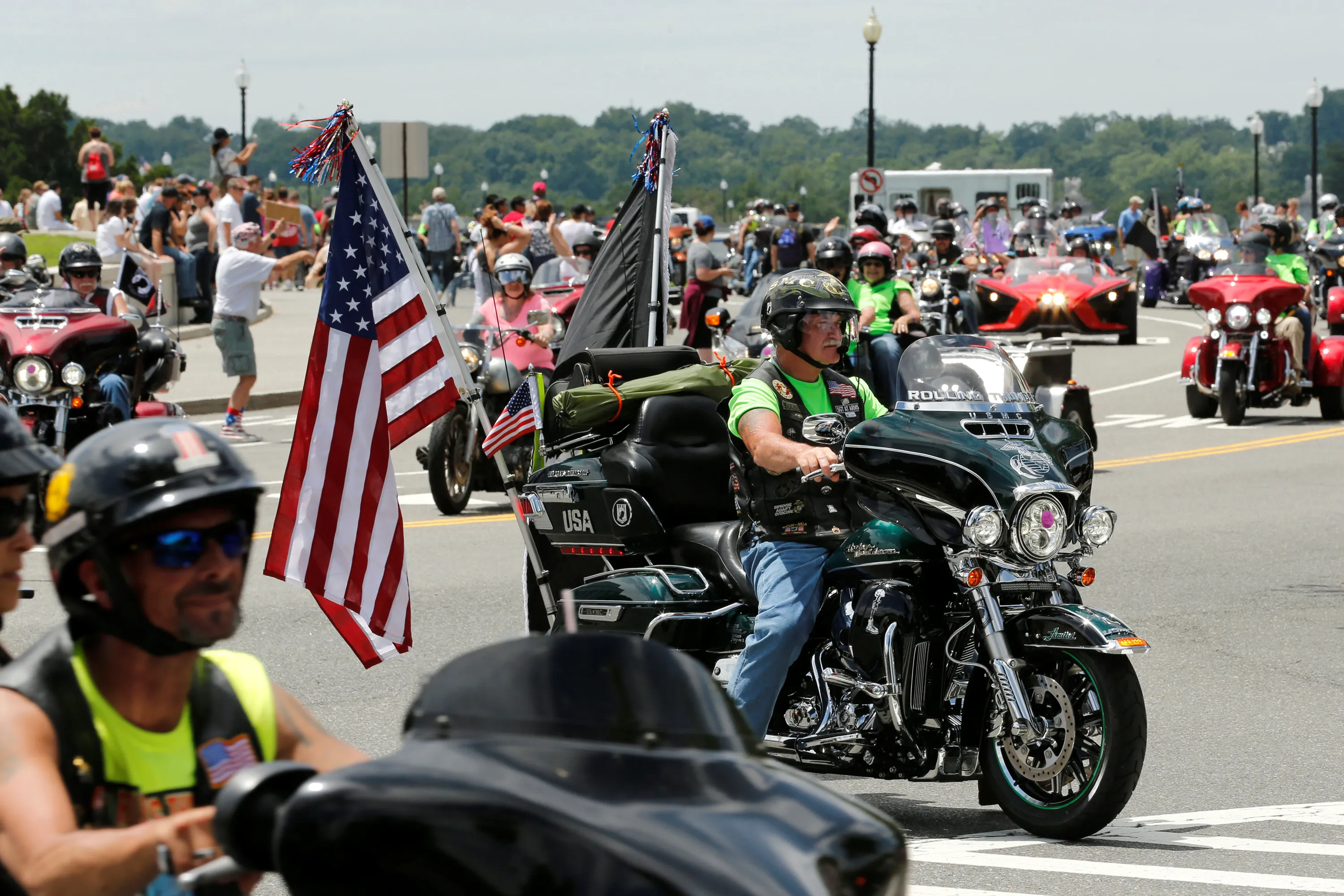 People line the route as motorcyclists participate in the Rolling Thunder motorcycle rally, the annual ride around Washington Mall to raise awareness for prisoners of war and soldiers still missing in action, on Memorial Day weekend in Washington, U.S., May 29, 2016. (Photo by Jonathan Ernst/Reuters)