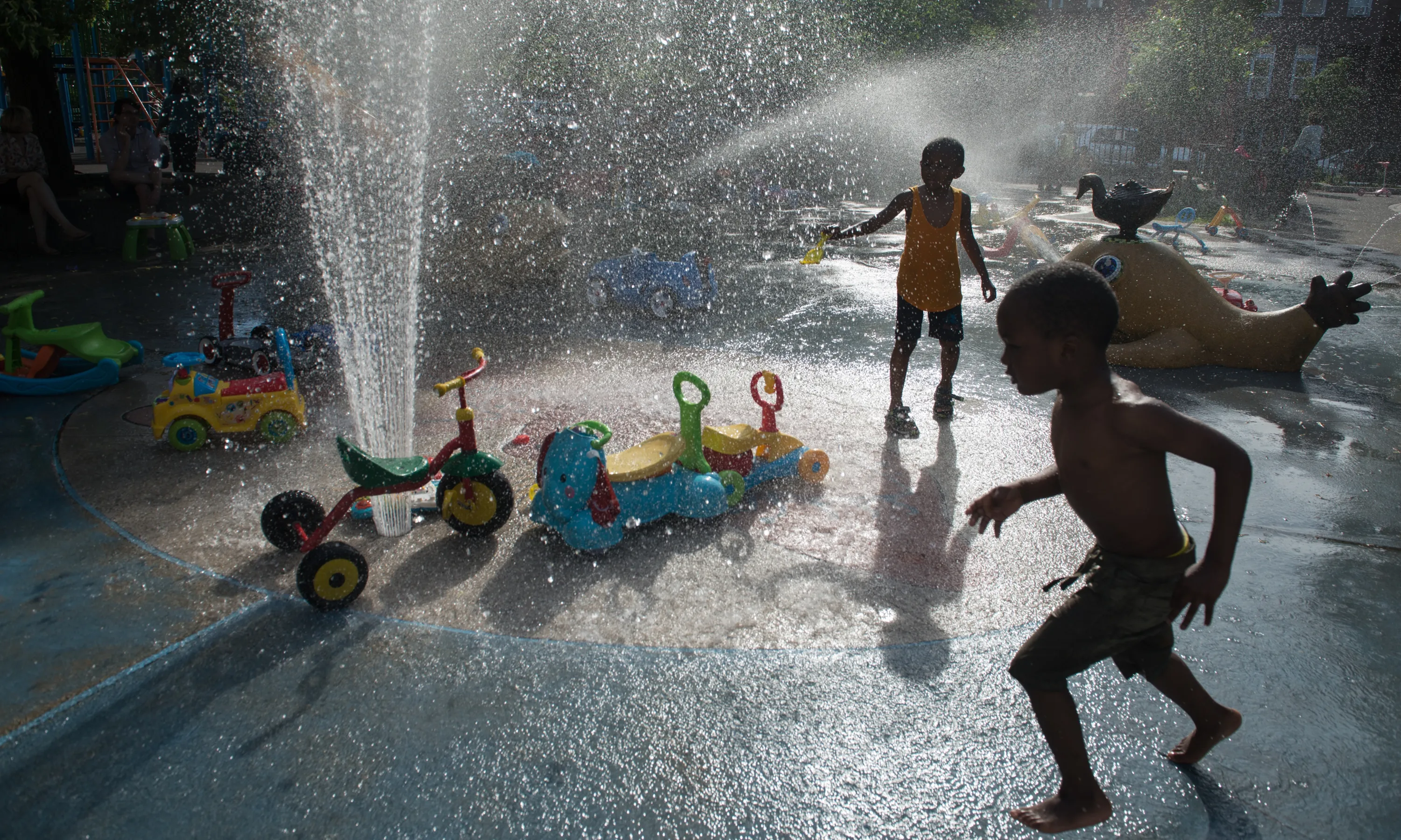 Children run through the sprinklers at a playground on May 29, 2016 in the Brooklyn borough of New York City. New York City is experiencing higher than average temperatures for the holiday weekend. (Photo by Stephanie Keith/Getty Images)