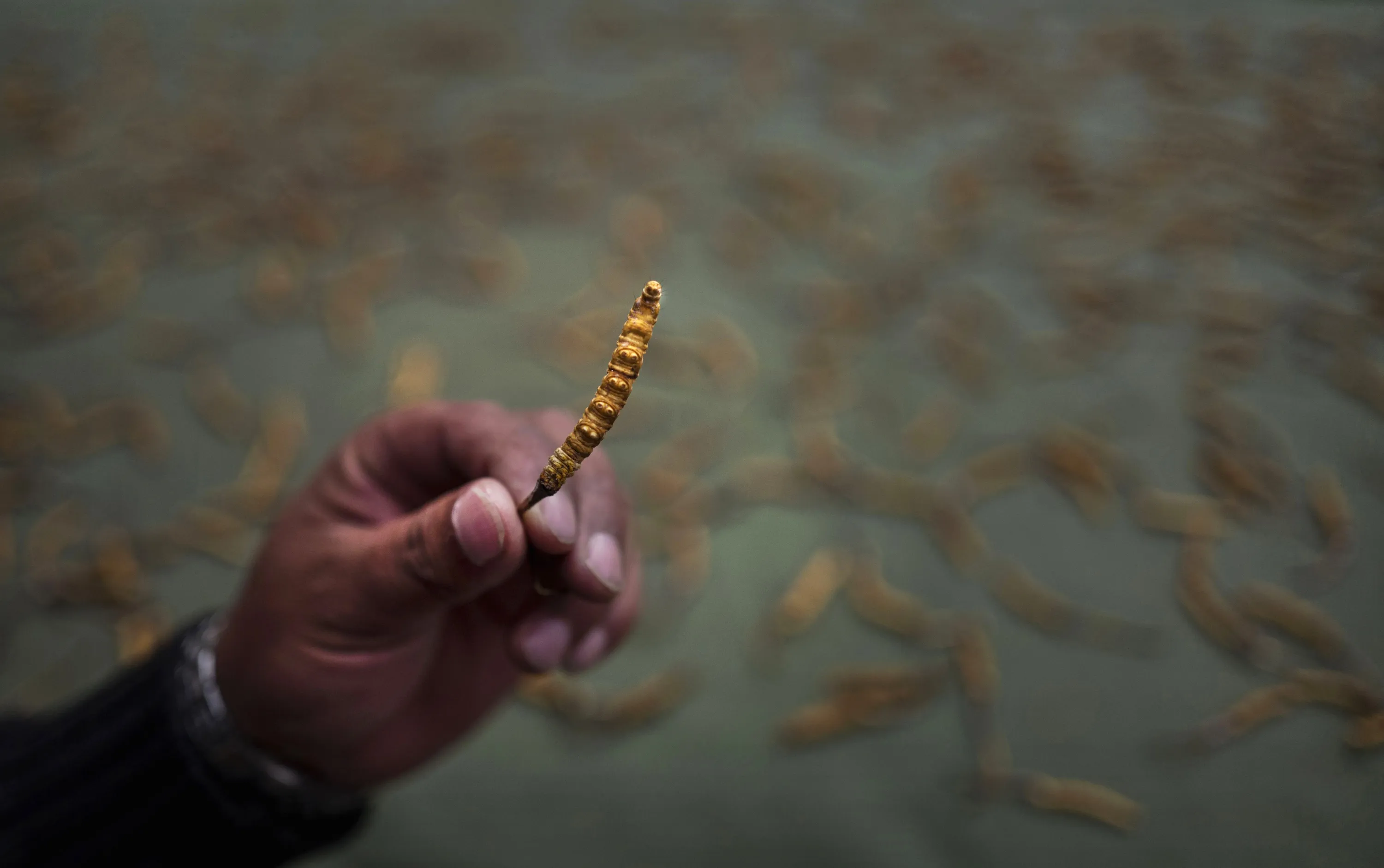 A Tibetan inspects high quality cordycep fungus on May 18, 2016 at a market in Yushu on the Tibetan Plateau in the Yushu Tibetan Autonomous Prefecture of Qinghai province. (Photo by Kevin Frayer/Getty Images)