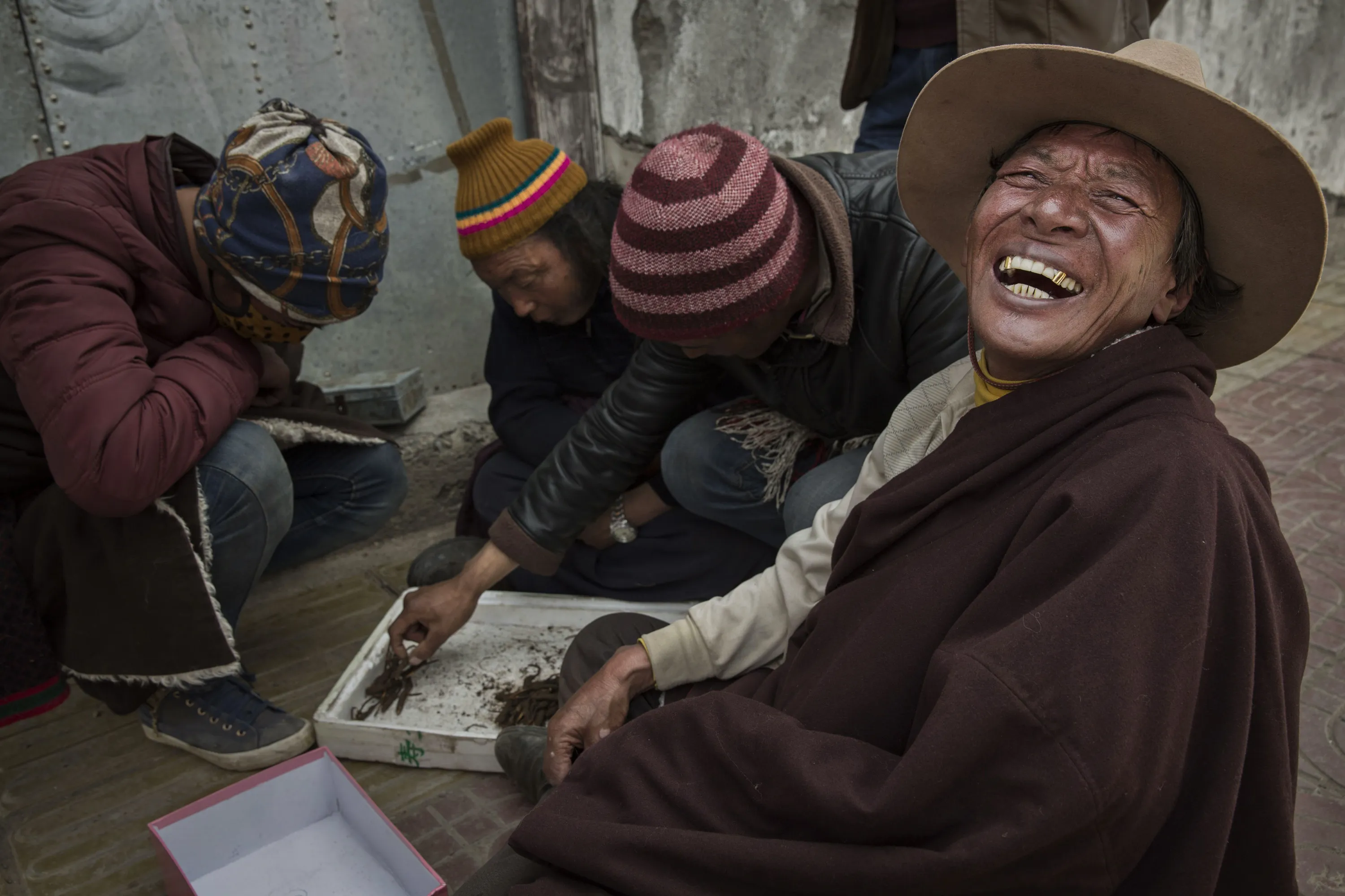 A Tibetan nomad laughs as vendors buy and sell cordycep fungus on May 20, 2016 at a market in Sershul on the Tibetan Plateau in the Garze Tibetan Autonomous Prefecture of Sichuan province. (Photo by Kevin Frayer/Getty Images)