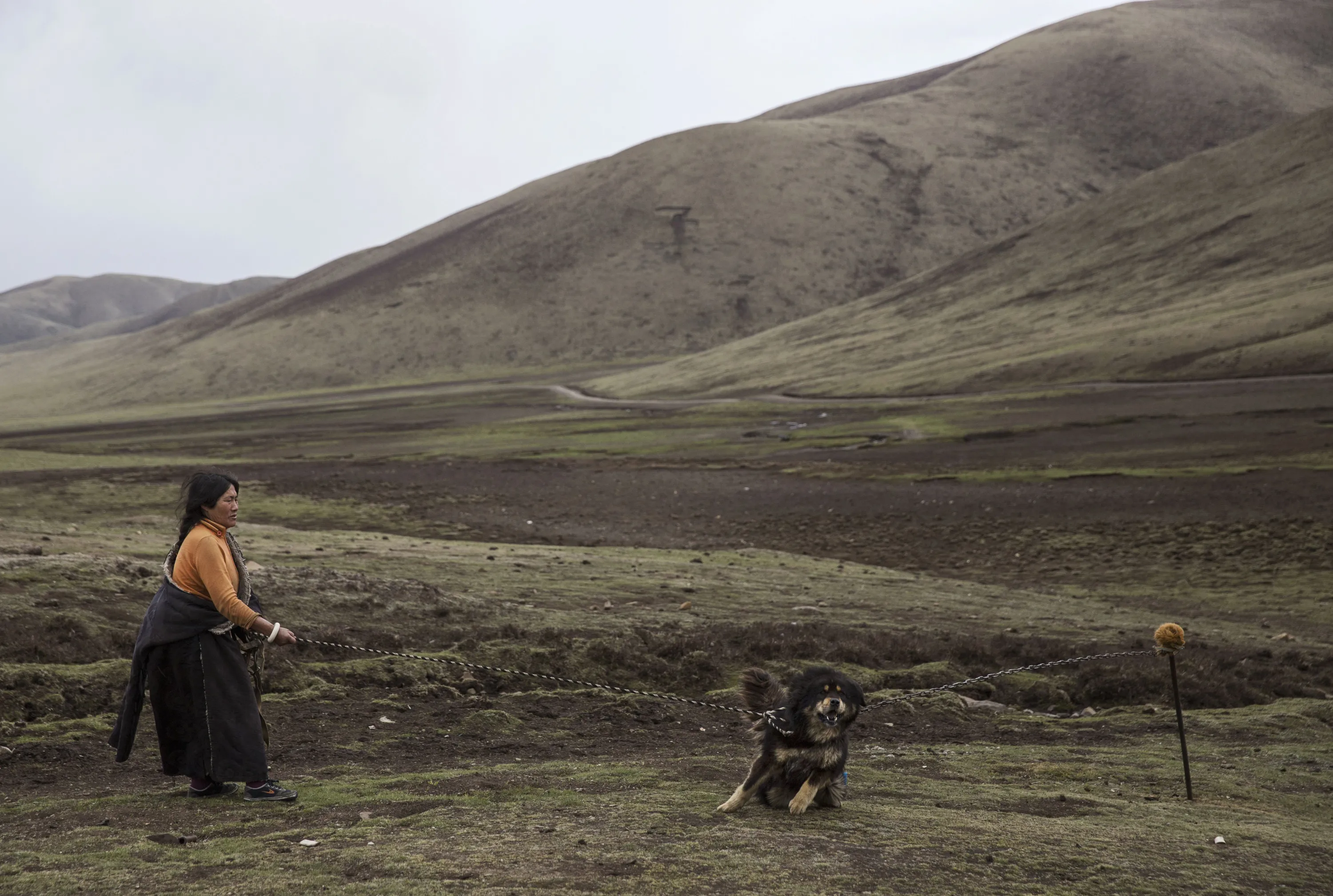 A Tibetan nomad holds her dog at a temporary camp for picking cordycep fungus on May 22, 2016 on the Tibetan Plateau near Sershul in the Garze Tibetan Autonomous Prefecture of Sichuan province. (Photo by Kevin Frayer/Getty Images)