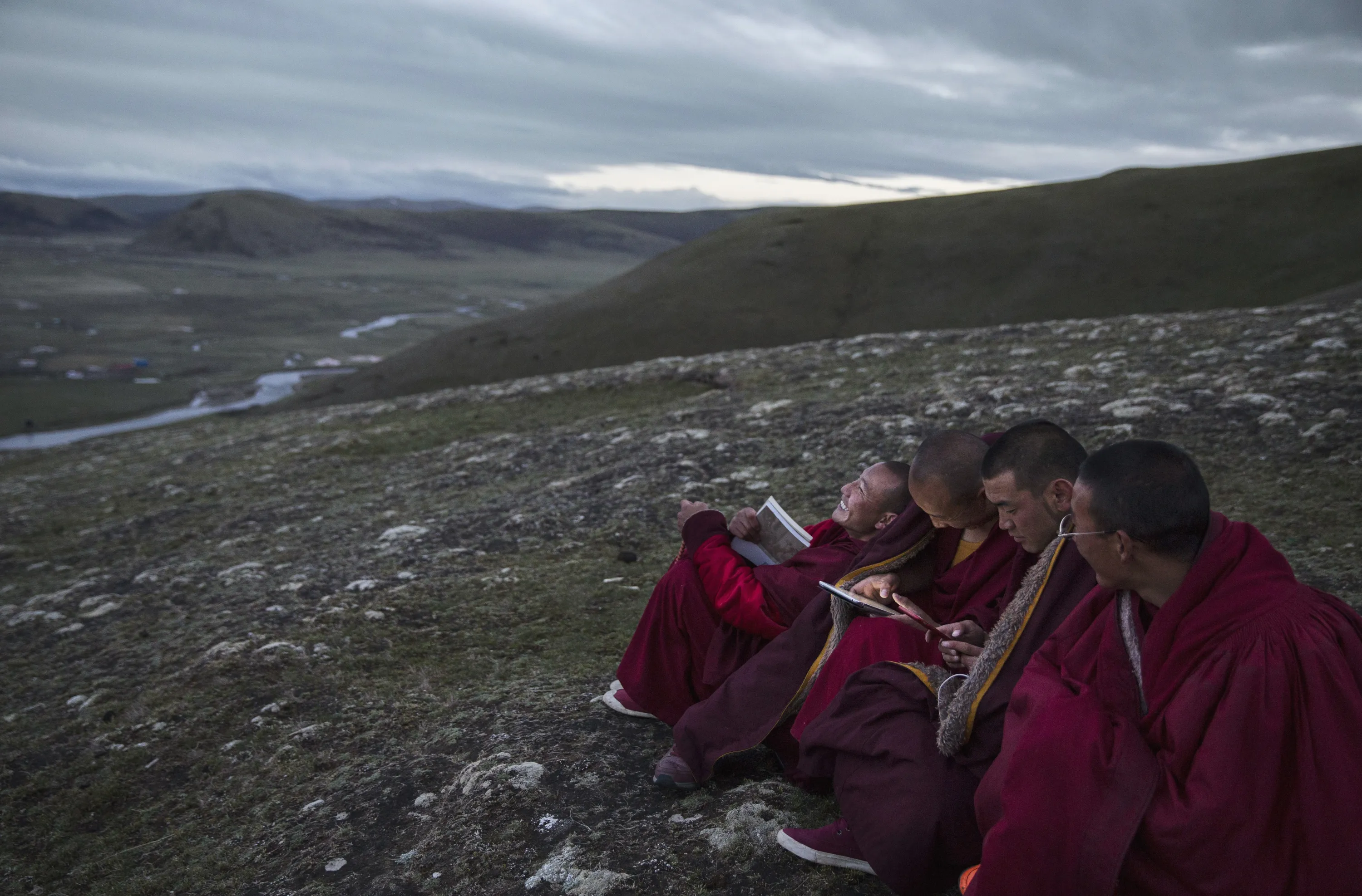 Young Tibetan monks, who are prohibited from picking cordycep fungus, read religious text under a full moon on the 15th day of Saka Dawa, the holiest day of the Buddhist calendar, at the Sershul Monastery on May 21, 2016 on the Tibetan Plateau in the Garze Tibetan Autonomous Prefecture of Sichuan province. (Photo by Kevin Frayer/Getty Images)