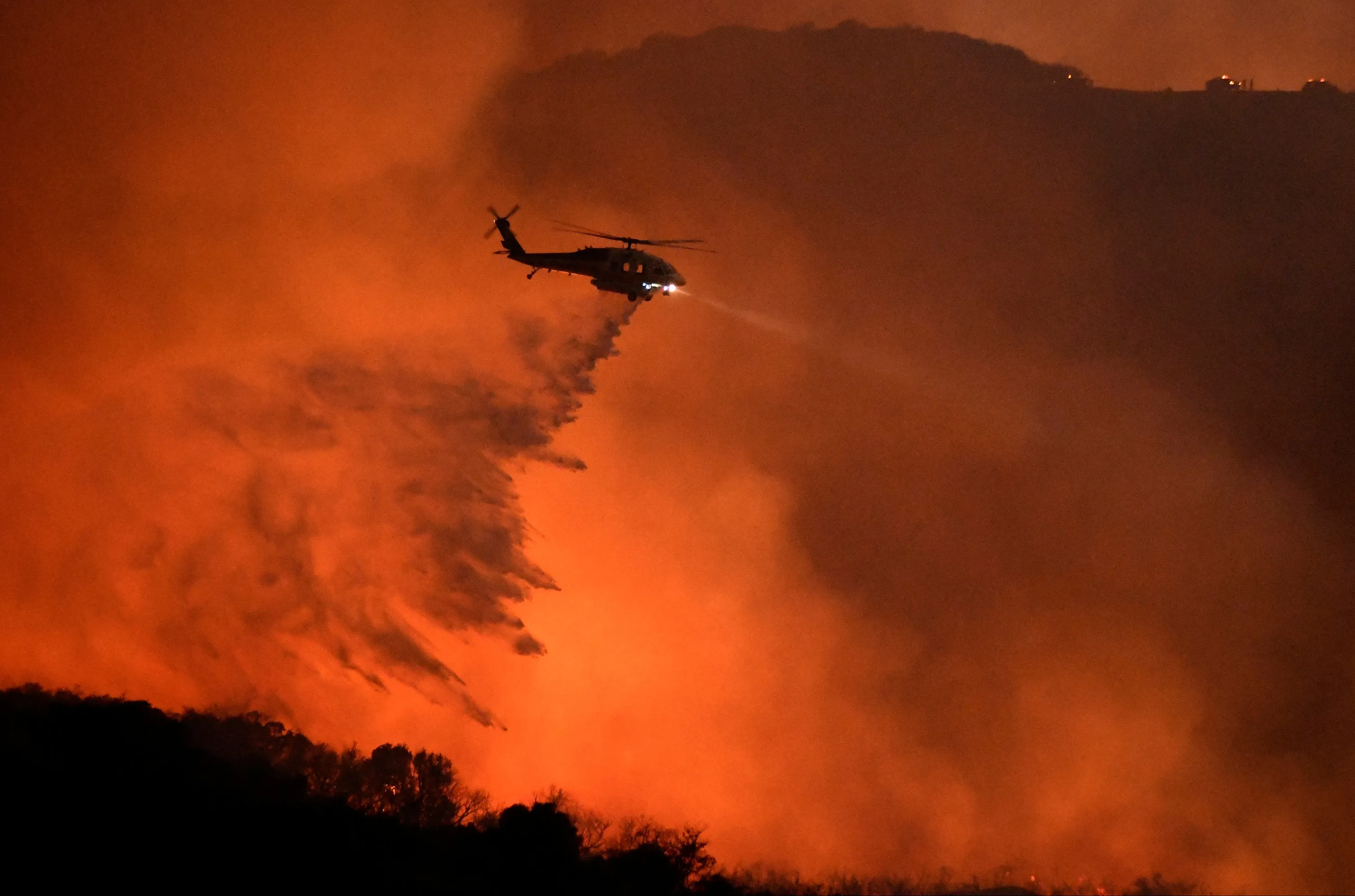 A helicopter makes a water drop at the “Old Fire”, which burned in Calabasas, California, U.S., June 4, 2016. (Photo by Gene Blevins/Reuters)