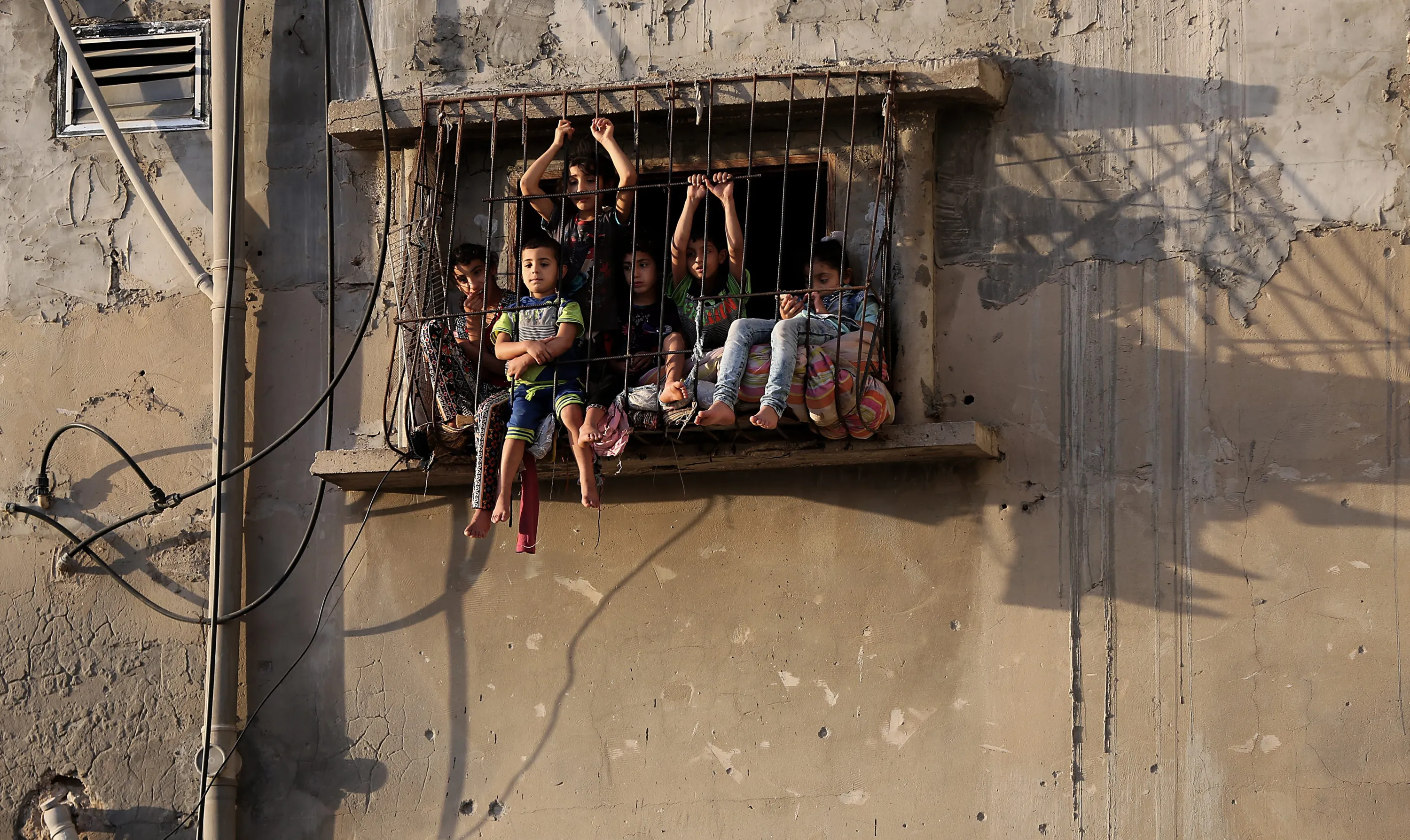 A picture made available on 06 May 2016 shows Palestinian children sitting at the window of their family house in the east of Al Shejaeiya neighborhood, east of Gaza City near the border between the Gaza strip and Israel, 05 May 2016. Israeli air strikes hit four Hamas sites in the east of Gaza City overnight. According to media reports, the airstrikes were conducted as retaliation for mortar attacks on Israeli Defense Force personnel along the border region. (Photo by Mohammed Saber/EPA)
