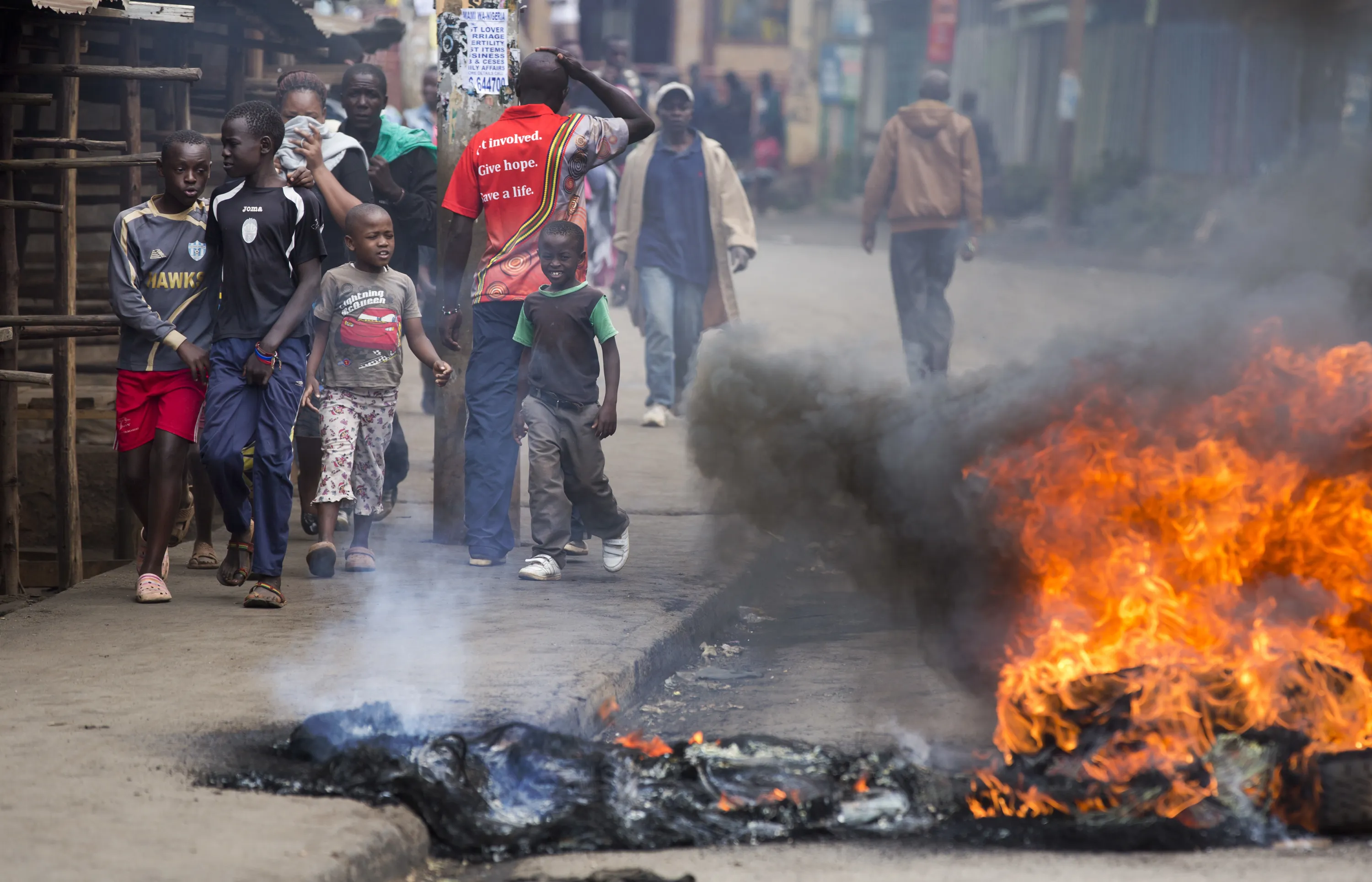 Young boys walk past a barricade of burning tyres, erected by demonstrators calling for the disbandment of the national electoral commission over allegations of bias and corruption, in the Kibera slum of Nairobi, Kenya Monday, June 6, 2016. While demonstrations led by opposition leaders in the capital were largely peaceful, police in the western town of Kisumu tear-gassed demonstrators who responded by throwing stones and witnesses say some people were killed by police. (Photo by Ben Curtis/AP Photo)