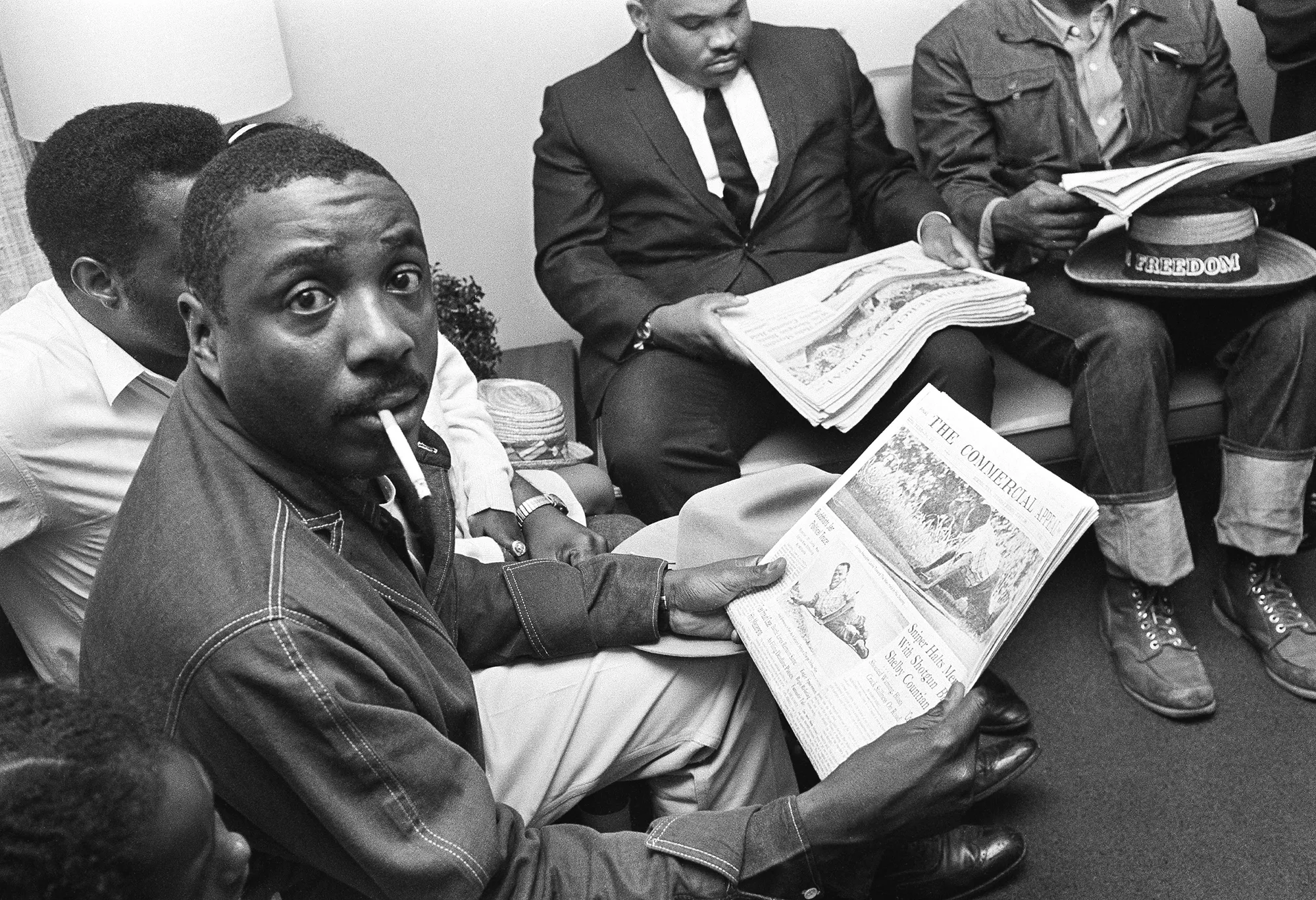 Chicago comedian Dick Gregory, wearing denim jacket and western attire, reads a Memphis newspaper as he waits in the administrator's office, June 7, 1966 at William F. Bowld Hospital in Memphis for word of James Meredith's condition. Gregory arrived in Memphis from Chicago with the announced purpose of taking up Meredith's Memphis-to-Jackson, Miss., march at the point, where Meredith was shot on Monday afternoon. (Photo by Charles Kelly/AP Photo)