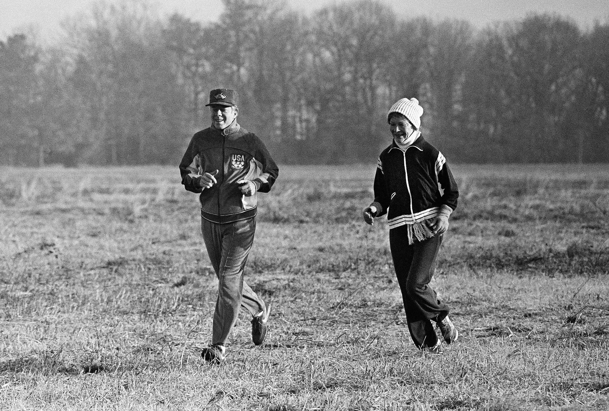 Former U.S. President Jimmy Carter and his wife Rosalynn jog across a frosty field in Plains, Ga., January 24, 1981. (Photo by Charles Kelly/AP Photo)