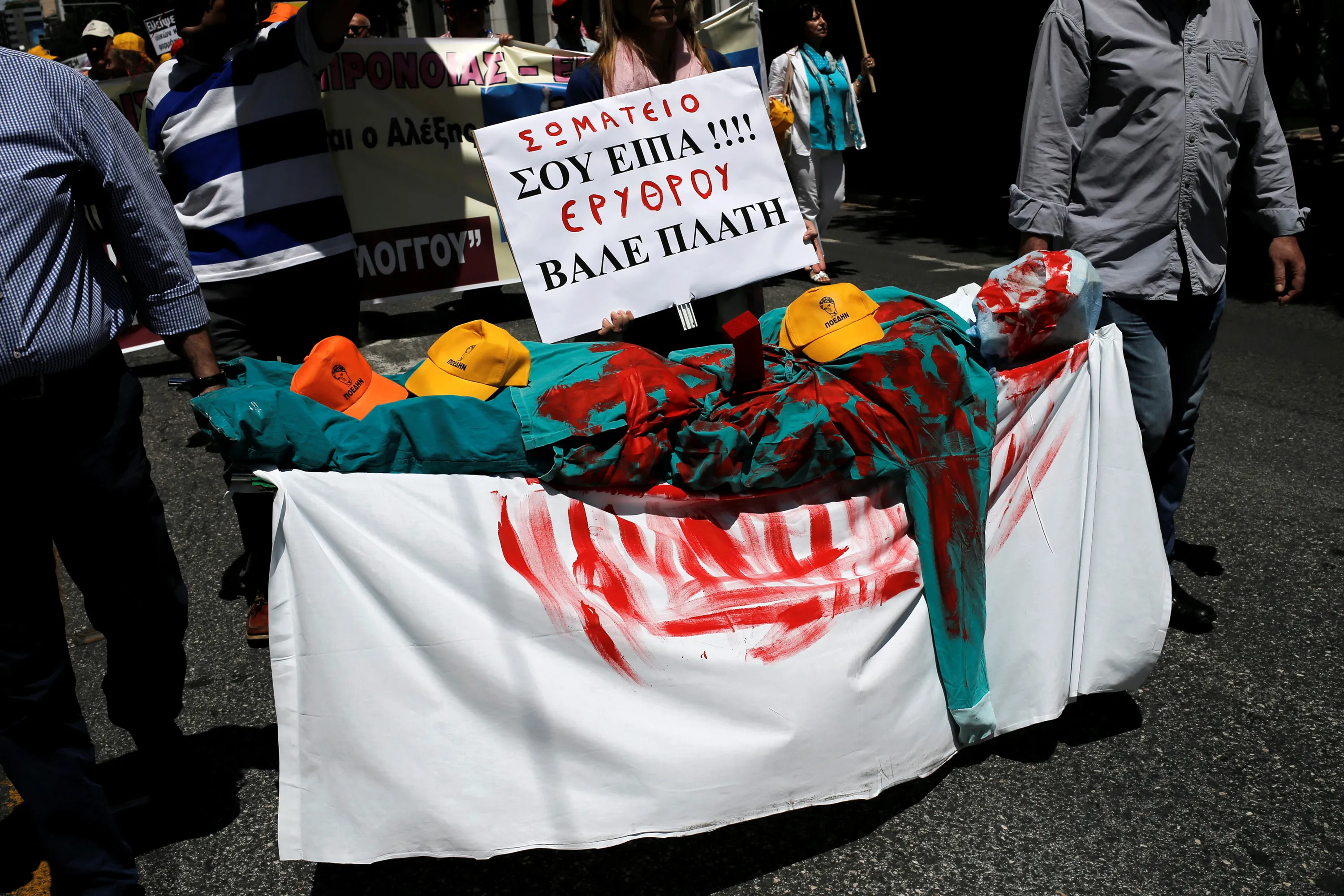 Health workers carry an effigy of an injured health worker during a demonstration marking a 24-hour strike of the state health sector, against pension and tax reforms in Athens, Greece, June 8, 2016. The placard reads “I told you to support”. (Photo by Alkis Konstantinidis/Reuters)