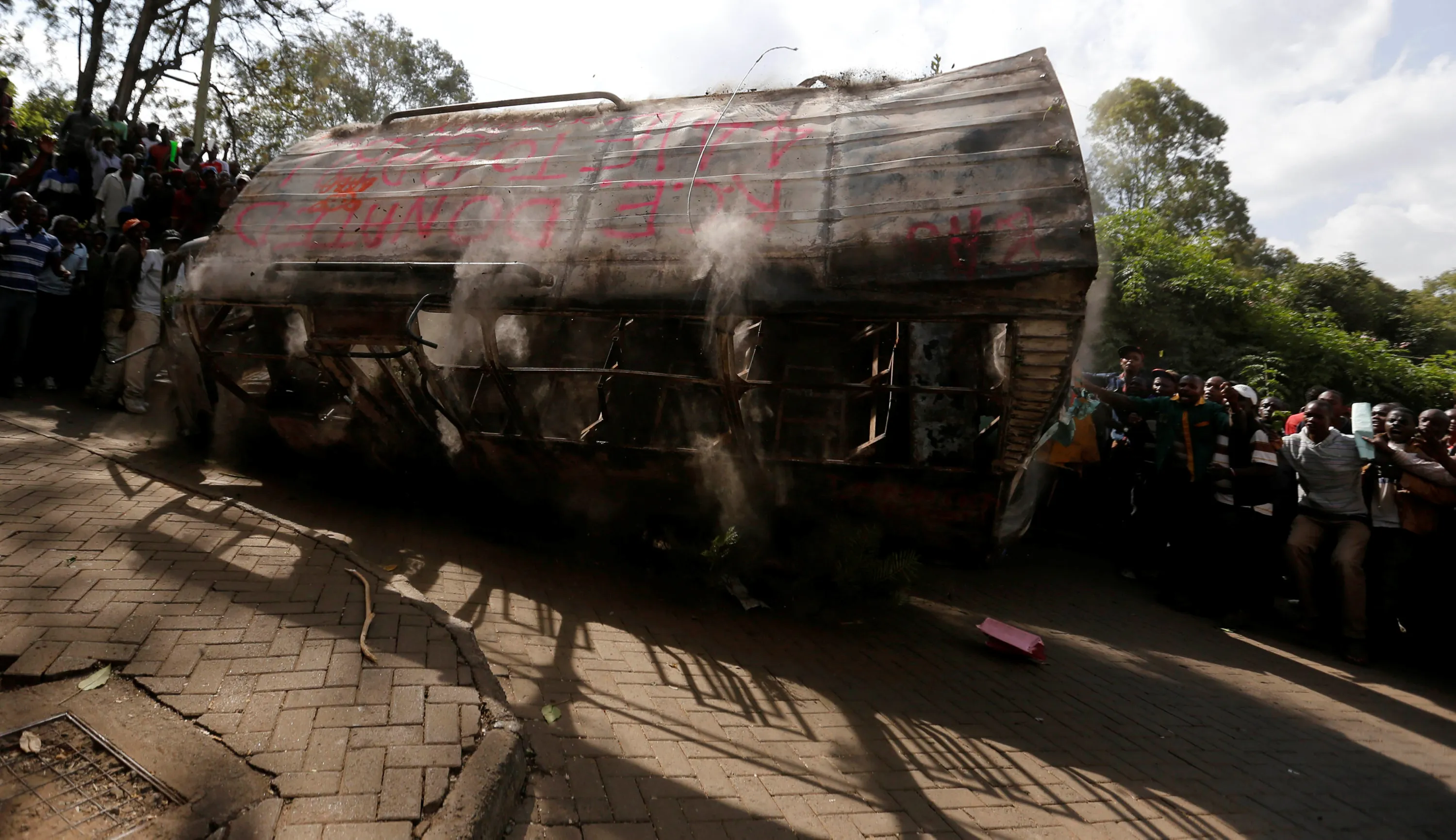 Members of Kenya's ruling Jubilee coalition dump the wreckage of a burnt mini-bus outside the office of opposition leader of the Coalition for Reforms and Democracy (CORD), Raila Odinga (not in the picture), as they demonstrate in support of the Independent Electoral and Boundaries Commission (IEBC) the electoral body ahead of next year's election in Nairobi, Kenya, June 8, 2016. (Photo by Thomas Mukoya/Reuters)