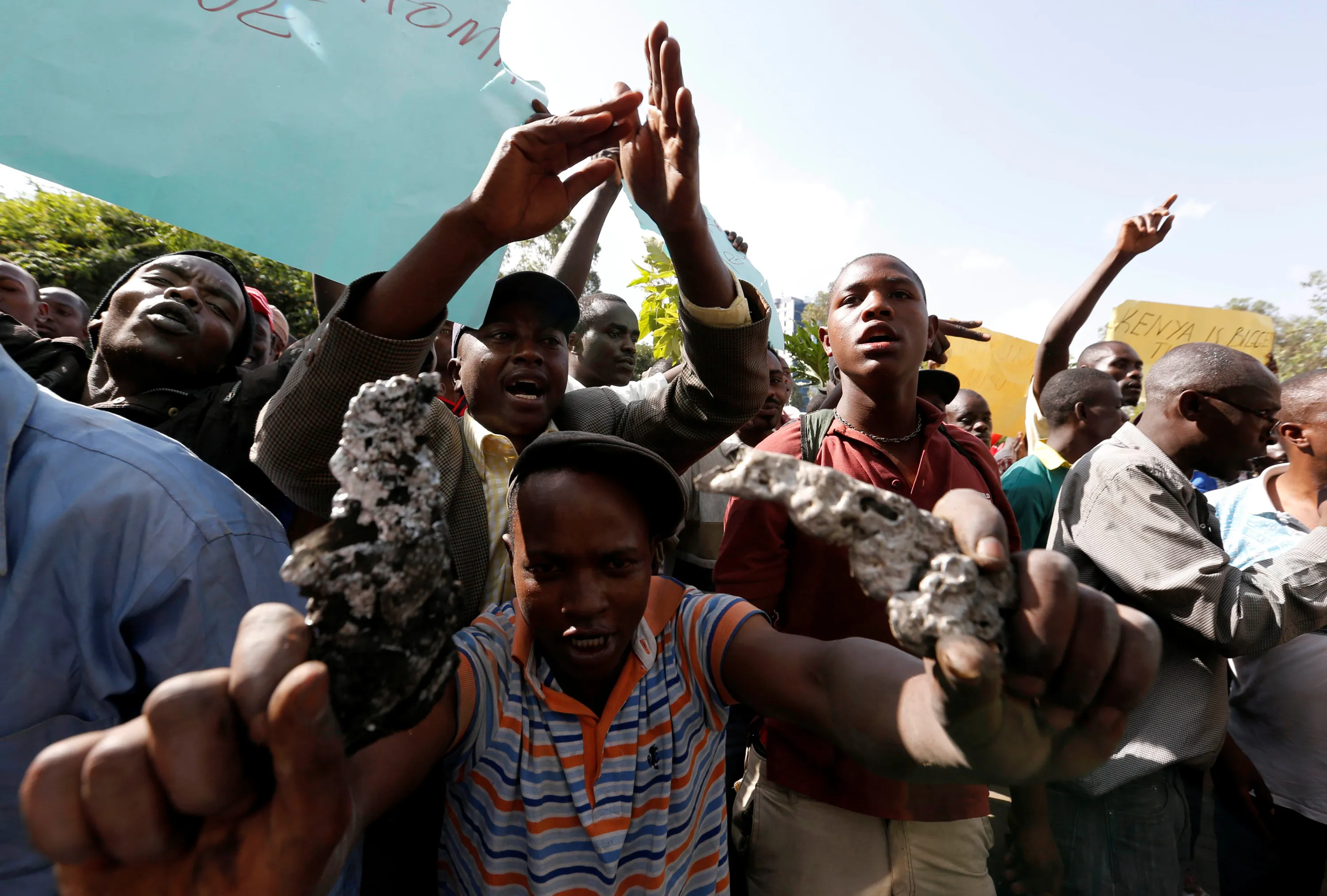 Members of Kenya's ruling Jubilee coalition chant slogans outside the office of opposition leader of the Coalition for Reforms and Democracy (CORD), Raila Odinga (not in the picture), as they demonstrate in support of the Independent Electoral and Boundaries Commission (IEBC) the electoral body ahead of next year's election in Nairobi, Kenya, June 8, 2016. (Photo by Thomas Mukoya/Reuters)