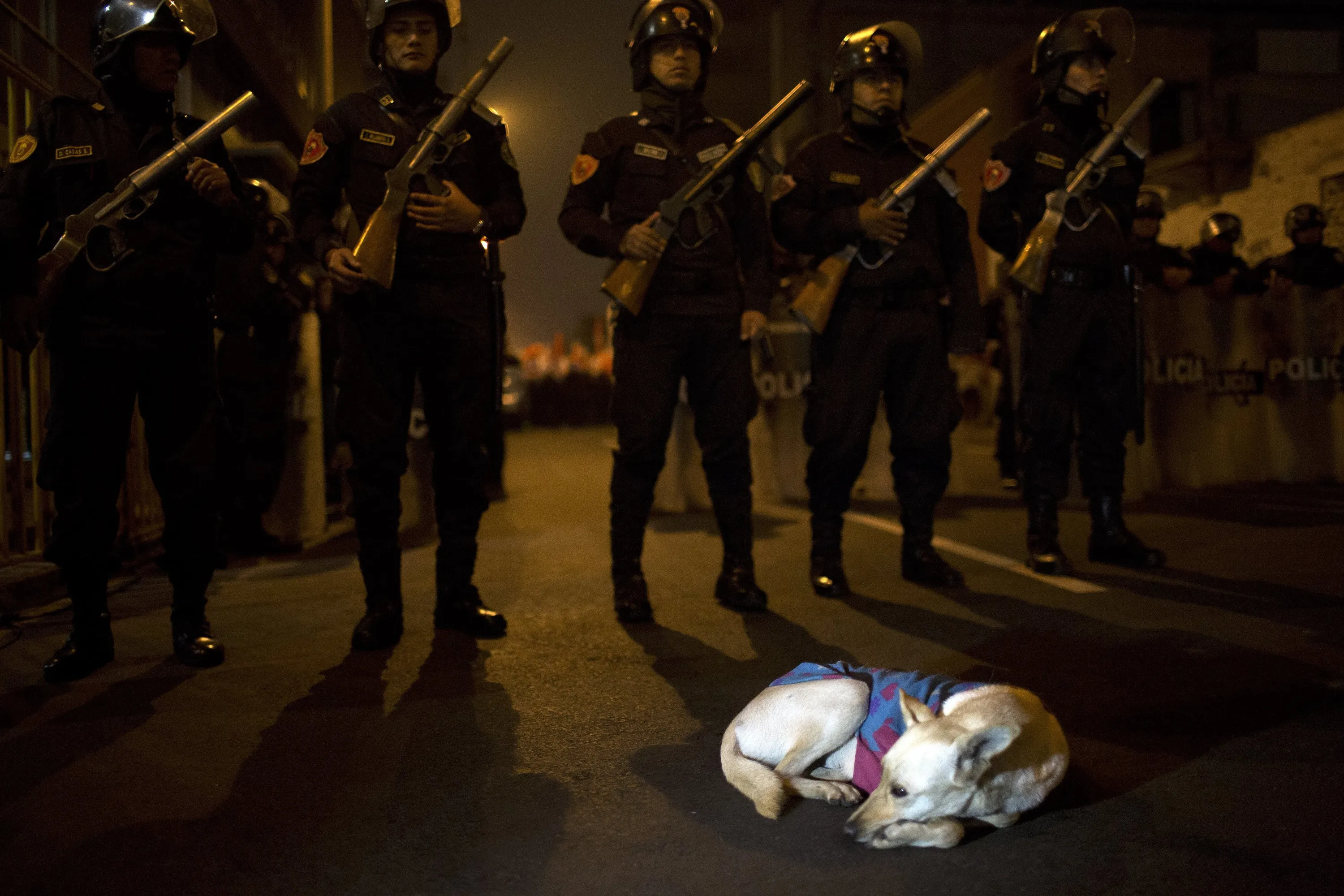 A dog curls up on a street in front of a line of riot police standing guard outside the National Office of Electoral Processes in Lima, Peru, Tuesday, June 7, 2016. The nail-biter race for Peru's presidency remained tight Tuesday night as Keiko Fujimori, the daughter of imprisoned ex-president Alberto Fujimori, gained ground on her rival, Pedro Pablo Kuczynski thanks to votes trickling in from remote rural areas. (Photo by Rodrigo Abd/AP Photo)