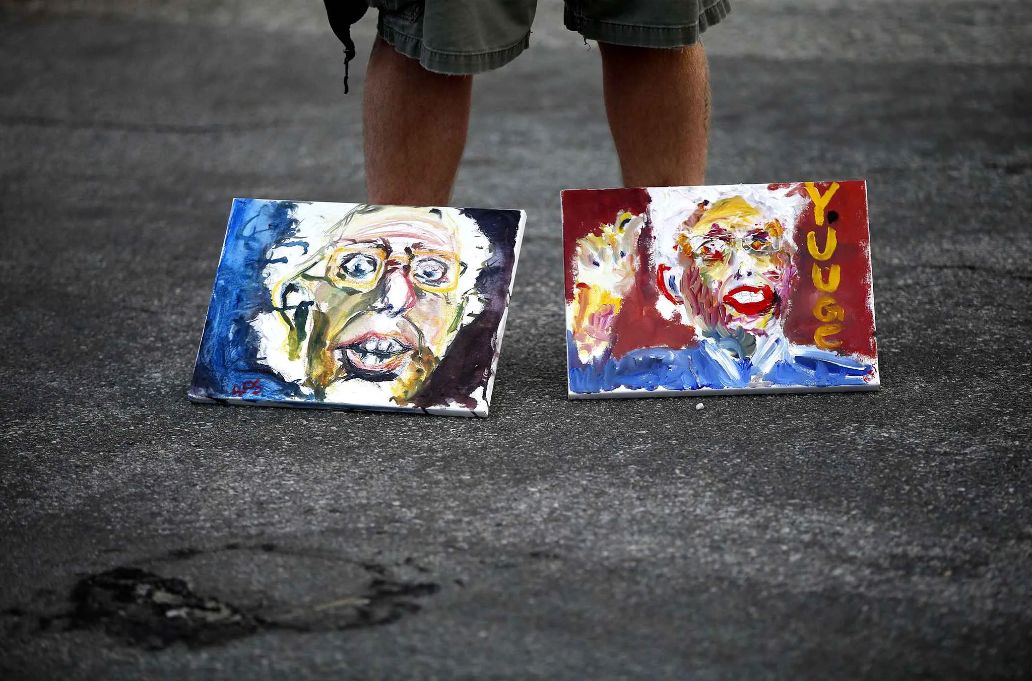 A man stands with paintings of Democratic presidential candidate Sen. Bernie Sanders, I-Vt., before a rally Tuesday, June 7, 2016, in Santa Monica, Calif. (Photo by John Locher/AP Photo)