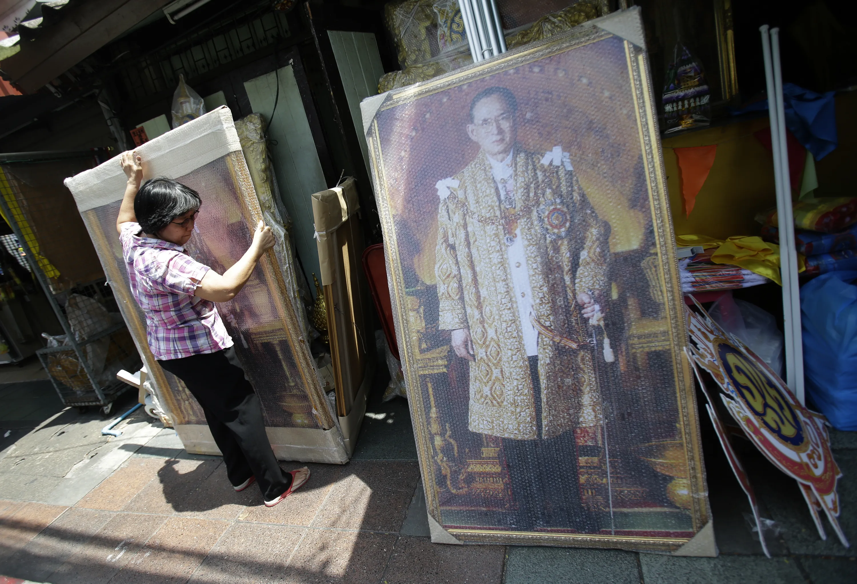In this Tuesday, June 7, 2016 photo, a shopkeeper places portraits of Thailand's King Bhumibol Adulyadej outside her shop in Bangkok, Thailand. (Photo by Sakchai Lalit/AP Photo)