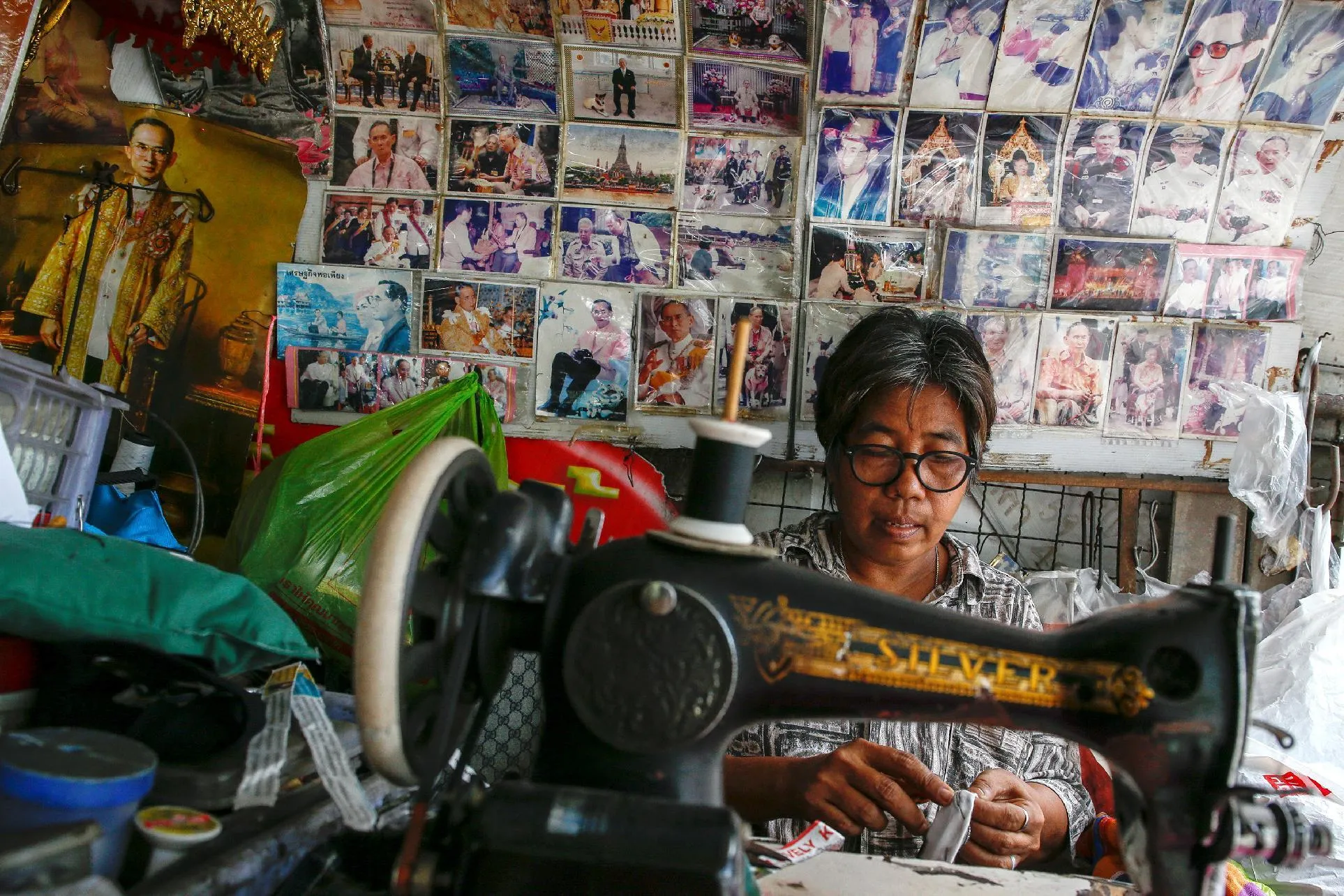 A woman works on a sewing machine on a street in front of a wall decorated with photographs of Thailand's King Bhumibol Adulyadej in Bangkok, Thailand, June 2, 2016. (Photo by Athit Perawongmetha/Reuters)