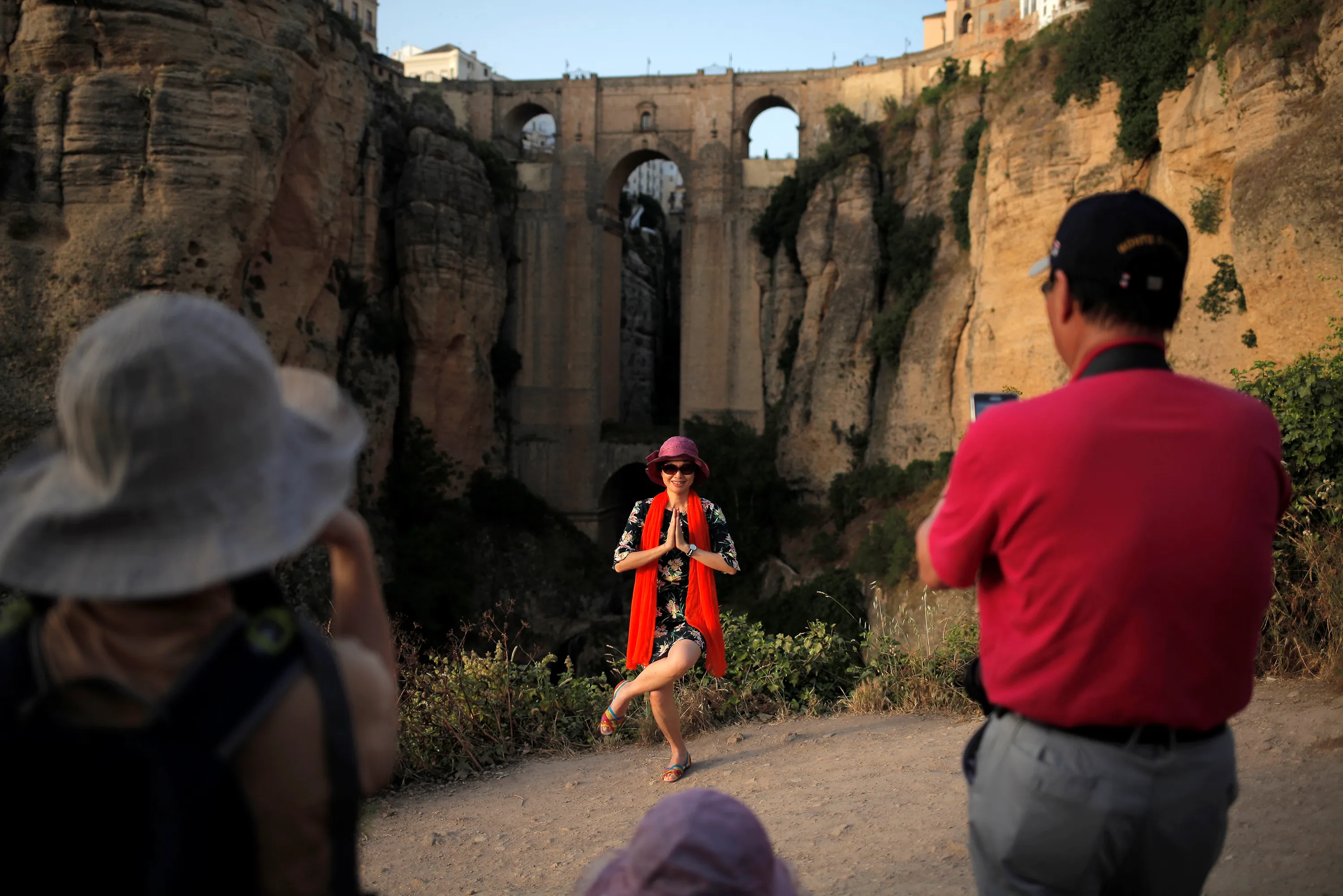 A Chinese tourist gestures as she is photographed by compatriots in front of the “Puente Nuevo” (New Bridge) in Ronda, southern Spain, June 8, 2016. (Photo by Jon Nazca/Reuters)