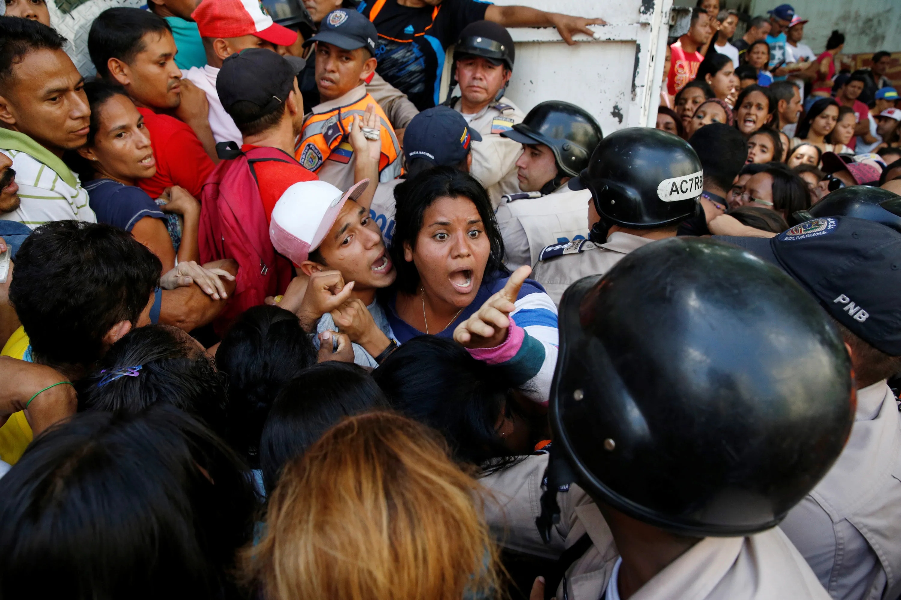 People gather to try to buy pasta while riot police try to control the crowd outside a supermarket in Caracas, Venezuela, June 10, 2016. (Photo by Carlos Garcia Rawlins/Reuters)