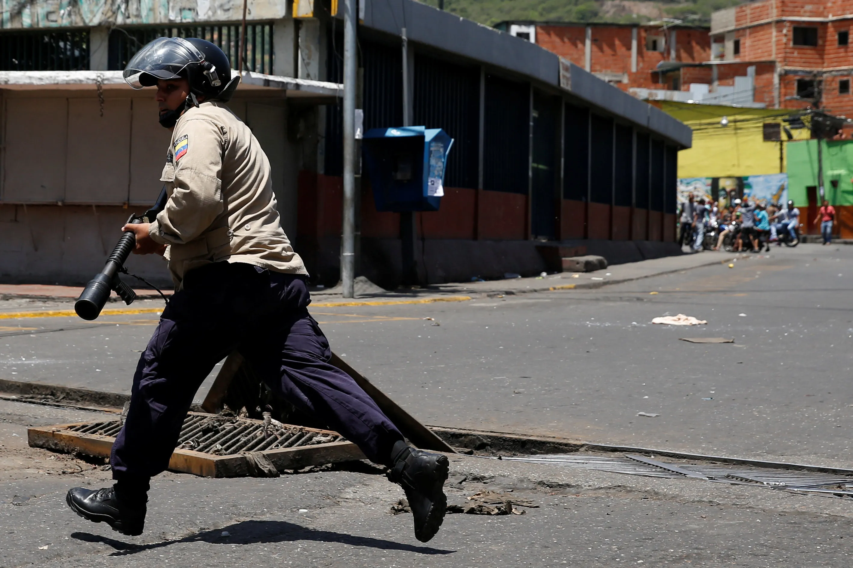 A riot policeman runs during clashes with Venezuelan protesters during a demonstration over food shortage and against Venezuelan President Nicolas Maduro's government in Caracas, Venezuela, June 10, 2016. (Photo by Carlos Garcia Rawlins/Reuters)