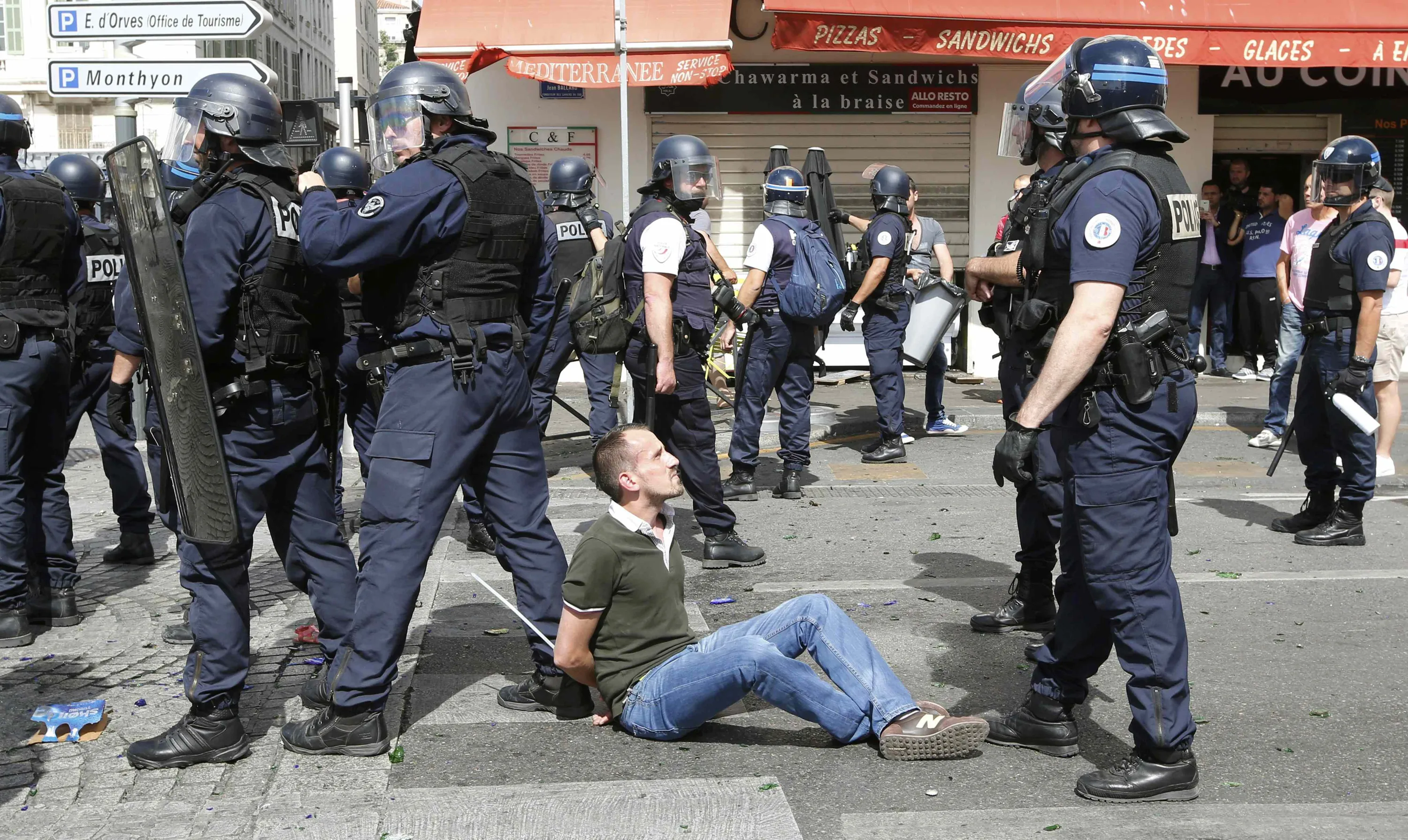 Football Soccer, Euro 2016, England vs Russia, Group B, Stade Velodrome, Marseille, France on June 11, 2016. Police detain a supporter at the old port of Marseille before the game. (Photo by Jean-Paul Pelissier/Reuters)