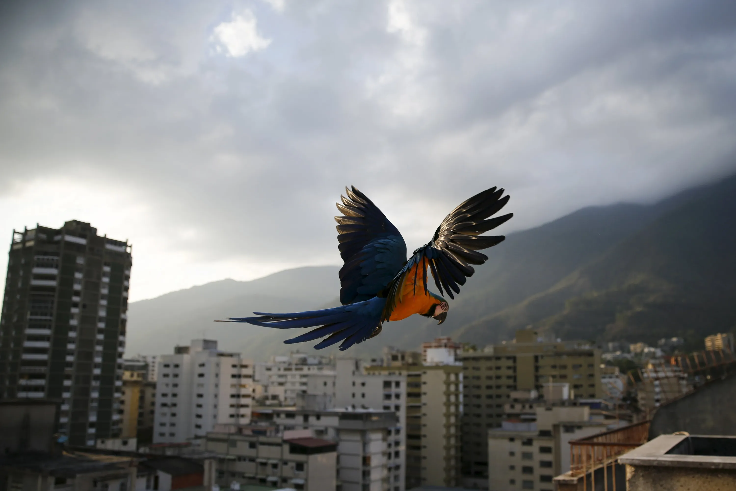 A macaw flies over buildings with the Avila mountain behind in Caracas March 31, 2015. Caracas, the world's second most violent city according to the United Nations, also suffers terrible traffic and residents spend hours in massive lines for scarce products. However, on antennae, rooves and windowsills, blue-and-yellow macaws (or Ara ararauna) break the harsh routine. Though originally native to rainforests from Panama to Paraguay, they have adapted well to Caracas thanks to the exuberant tropical vegetation surging between skyscrapers. (Photo by Jorge Silva/Reuters)