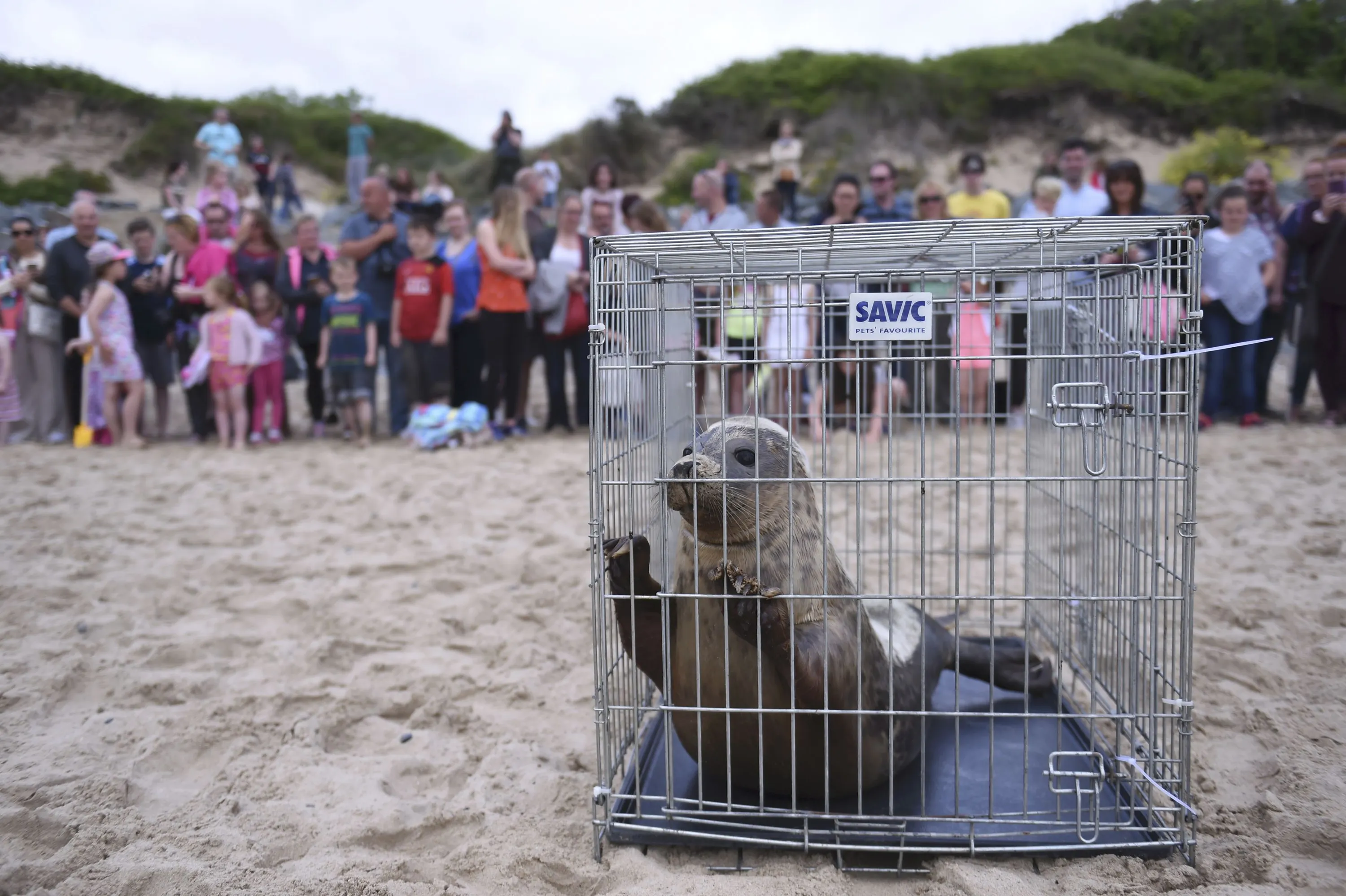 A Common seal named Groot is placed on Courtown beach in preparation to be released from Seal Rescue Ireland wildlife sanctuary where two rescued and rehabilitated seals are released back into the sea after months of care in Wexford, Ireland, June 12, 2016. (Photo by Clodagh Kilcoyne/Reuters)