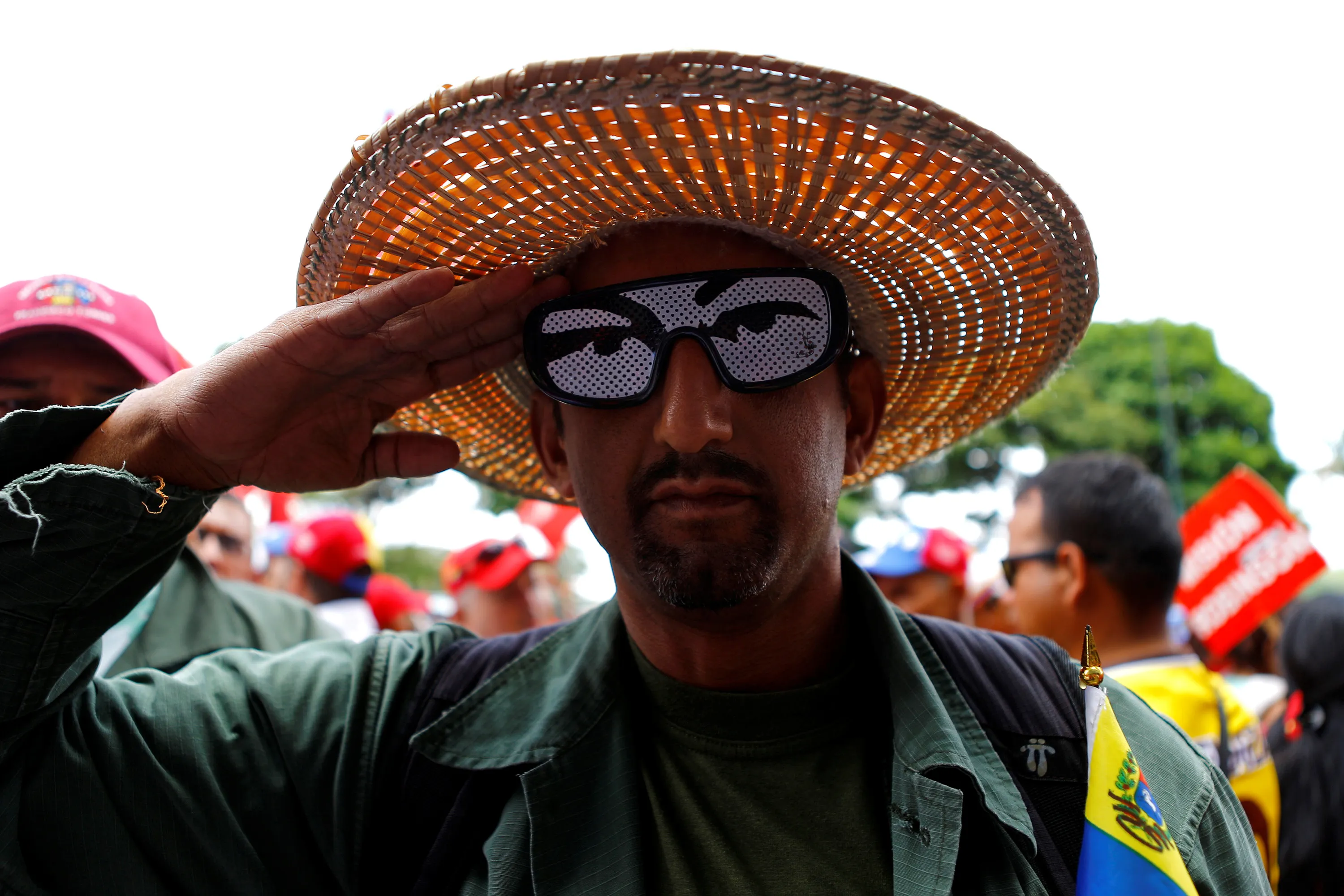 A pro-government supporter wears glasses with the eyes of Venezuela's late President Hugo Chavez during a rally of members of the education sector in Caracas, Venezuela June 14, 2016. (Photo by Ivan Alvarado/Reuters)