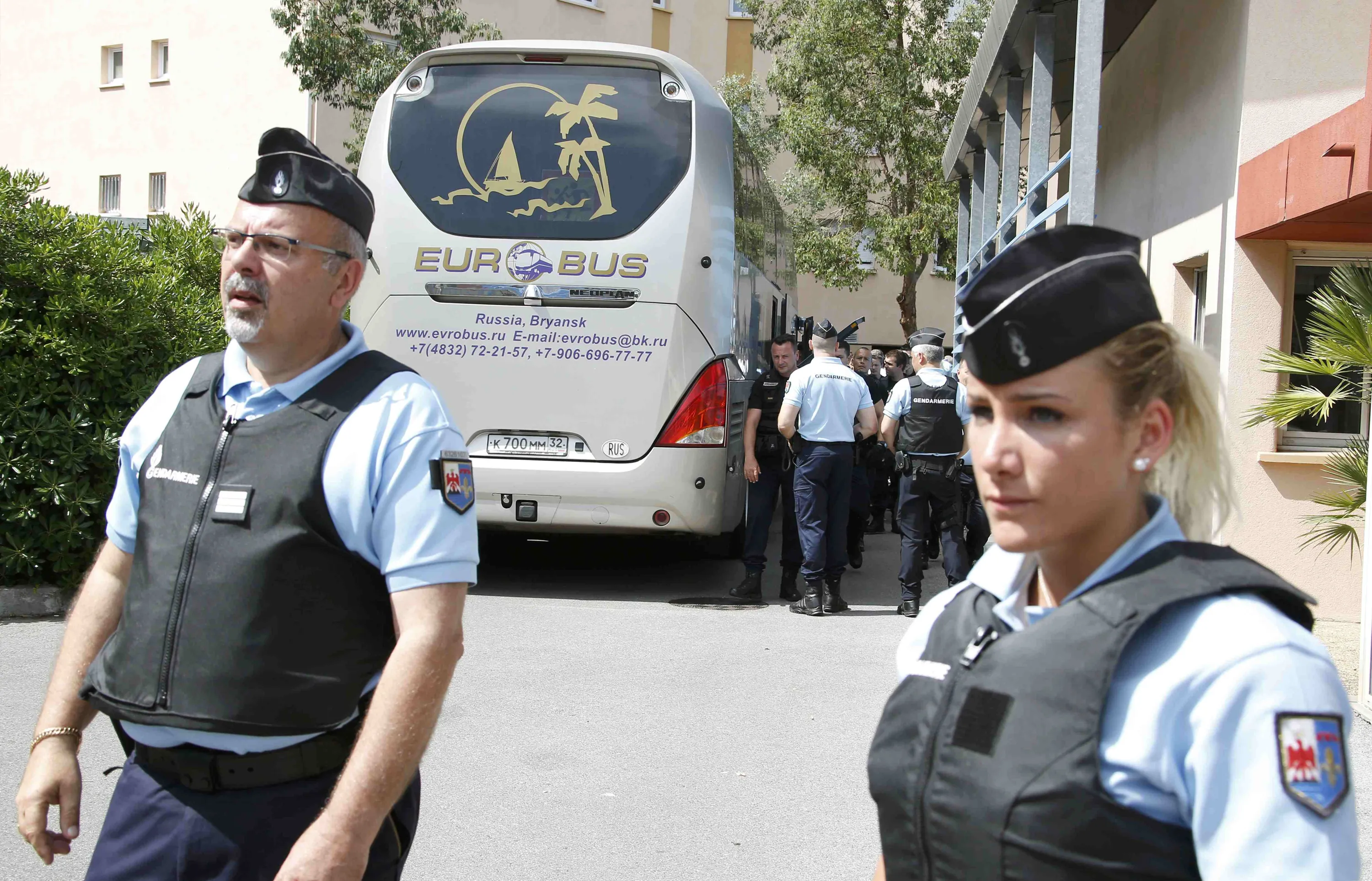 Russian soccer fans, suspected of being involved in clashes, are ushered off their bus after being stopped by gendarmes in Mandelieu near Cannes in southern France, June 14, 2016. (Photo by Eric Gaillard/Reuters)
