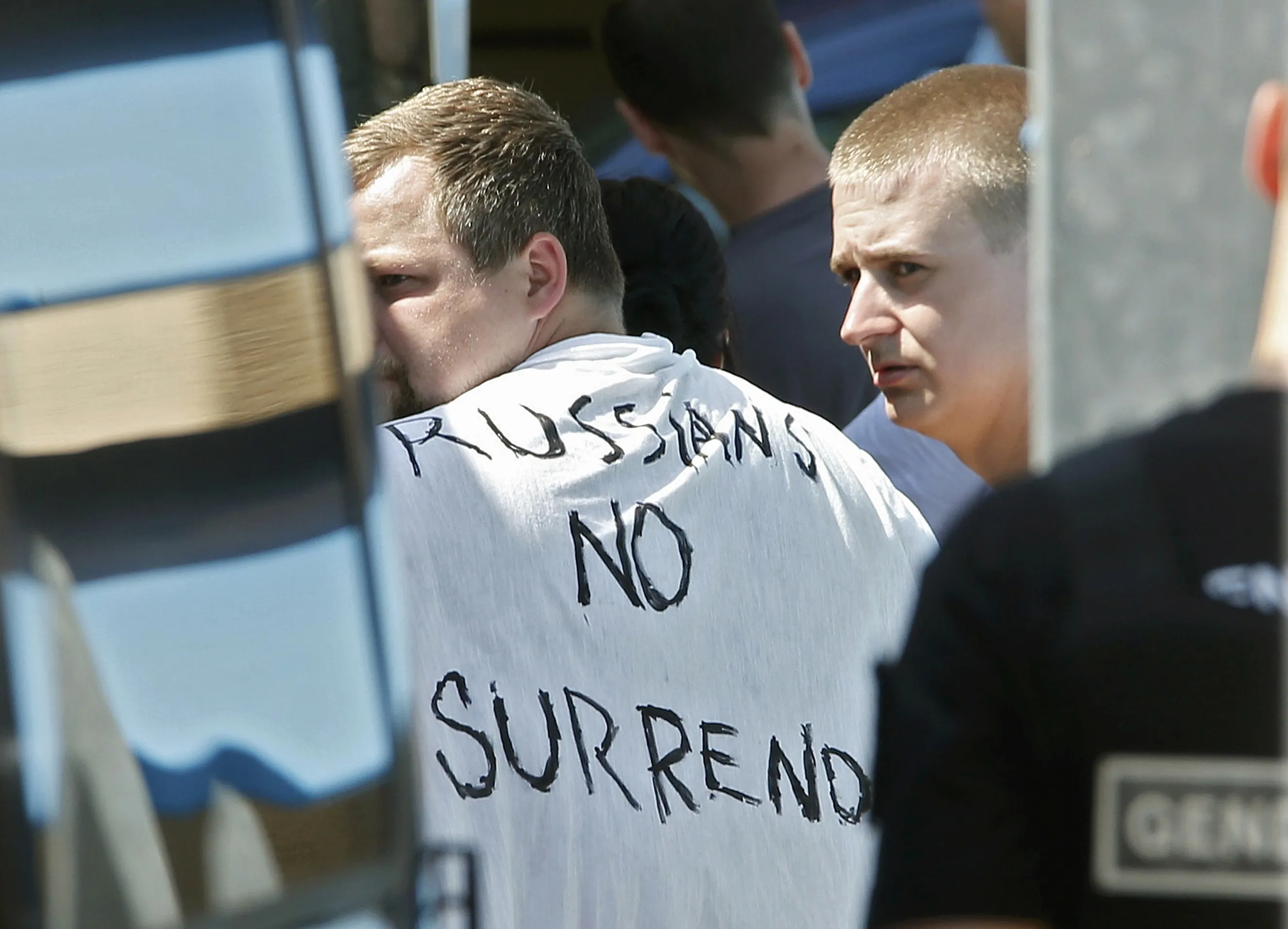 Russian soccer fans suspected of being involved in clashes, one wearing a banner saying “Russians No Surrender”, are ushered off their bus after being stopped by gendarmes in Mandelieu near Cannes in southern France, June 14, 2016. (Photo by Eric Gaillard/Reuters)