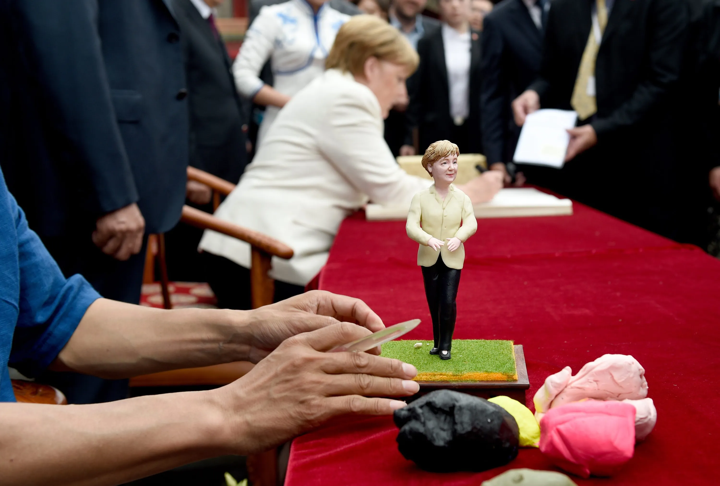German Chancellor Angela Merkel writes in a book near a figurine of herself, near the Shenyang Imperial Palace, China, 14 June 2016. Merkel is on an official visit to the Asian nation. (Photo by Rainer Jensen/EPA)