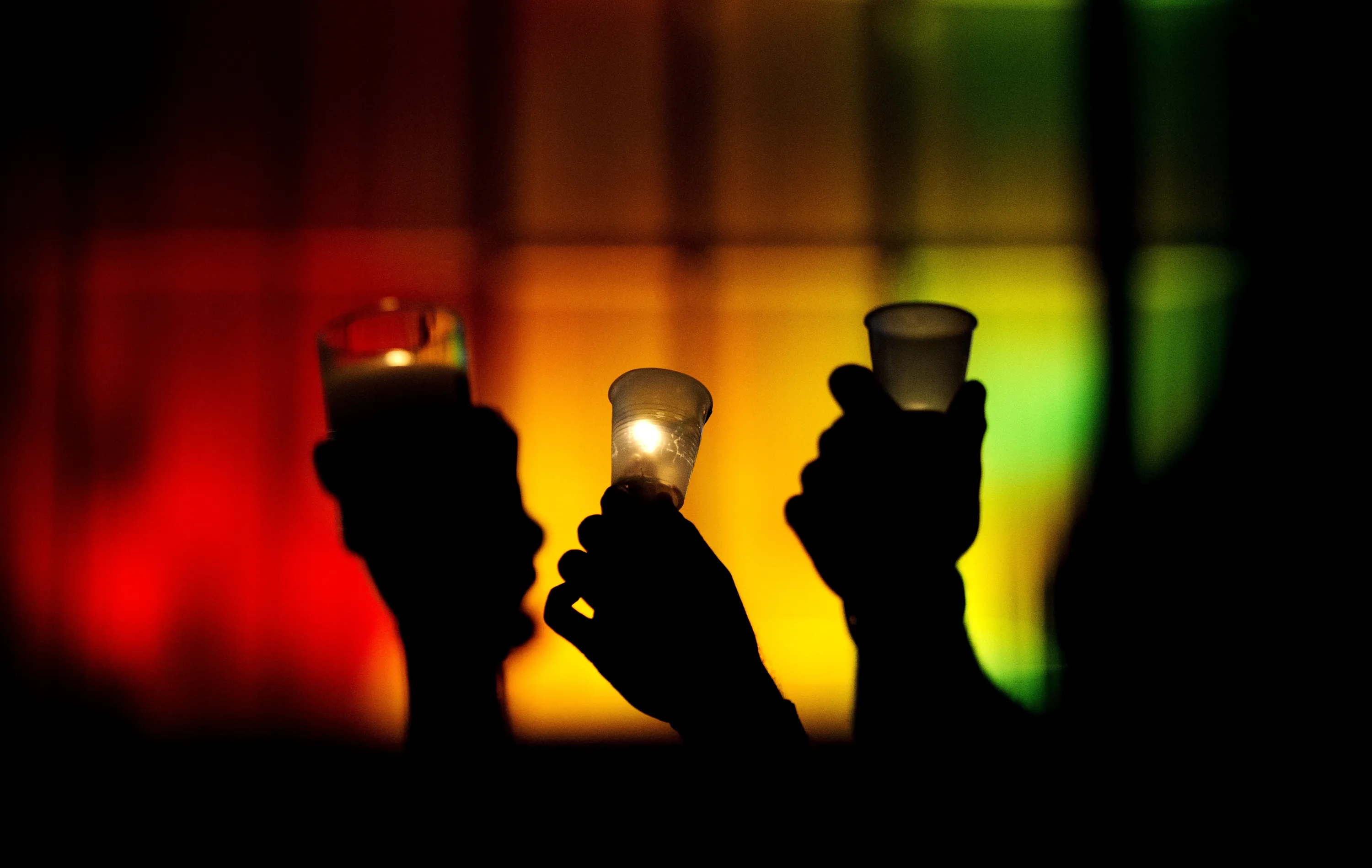 People hold up candles against a rainbow lit backdrop during a vigil for those killed in a mass shooting at the Pulse nightclub downtown Monday, June 13, 2016, in Orlando, Fla. A gunman has killed dozens of people in a massacre at a crowded gay nightclub in Orlando on Sunday, making it the deadliest mass shooting in modern U.S. history. (Photo by David Goldman/AP Photo)